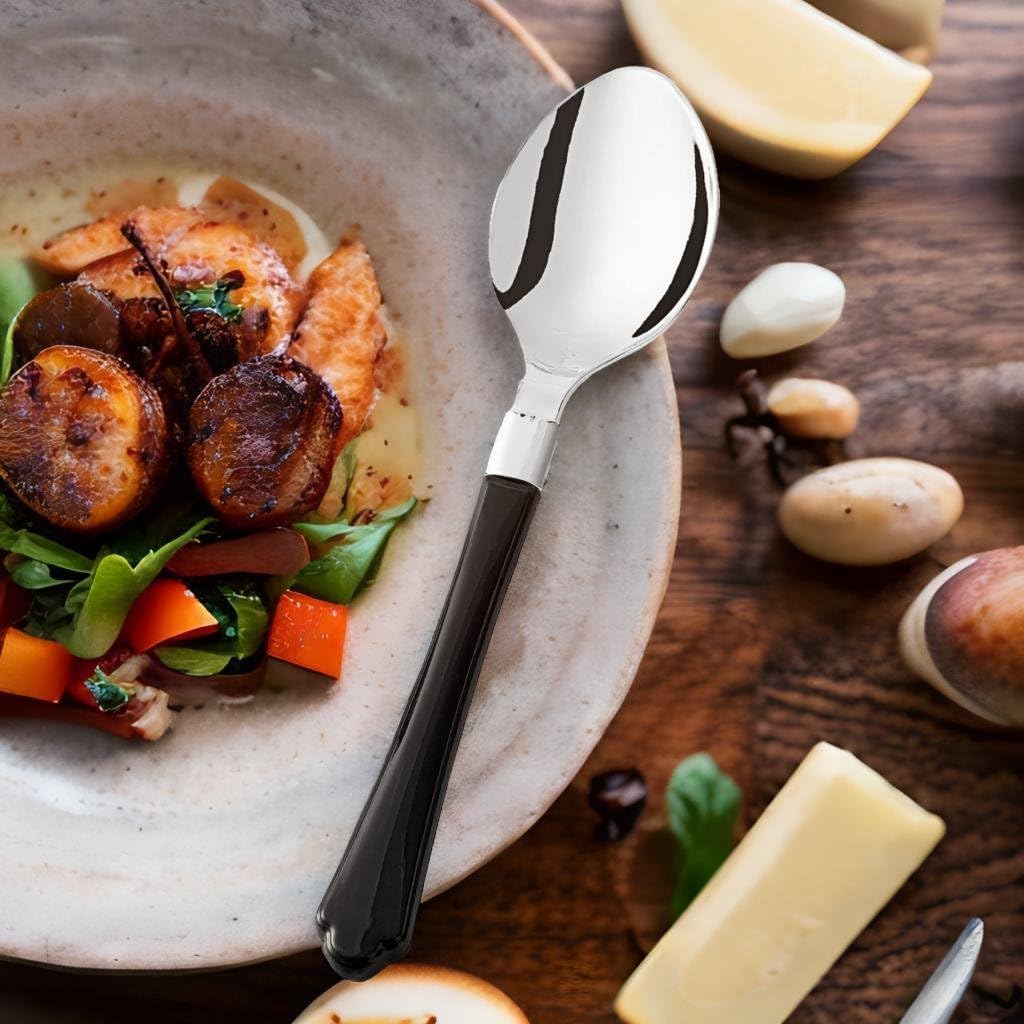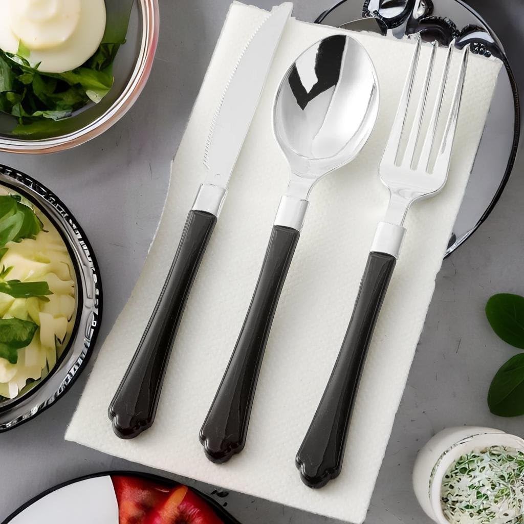 Complete 300-Piece Set – Includes 100 forks (7"), 100 knives (7.5"), and 100 spoons (6.25")—perfect for serving guests at large gatherings, family dinners, or catered events. Elevate your serving and presentation with the GEEX DEPOT Heavy Weight Black Handled Plastic Cutlery Set. This set mimics the look of metallic cutlery at a fraction of the cost, featuring sleek black handles for a sophisticated touch. This disposable flatware is ideal for weddings, parties, and catered events and adds an elegant flair without the expense of traditional cutlery. This set includes a fork, knife, and spoon, providing guests with everything they need for a meal. Despite its disposable nature, this cutlery boasts a heavy-weight design, ensuring durability and preventing bending, breaking, or snapping, even with heavy foods like chicken. The shiny silver finish and elegant black handles give this cutlery the appearance of real silverware, enhancing the dining experience for your guests. Additionally, its disposable nature eliminates the need for washing, making cleanup convenient for your staff. Elevate your table setting with the GEEX DEPOT Heavy Weight Black Handled Plastic Cutlery Set.