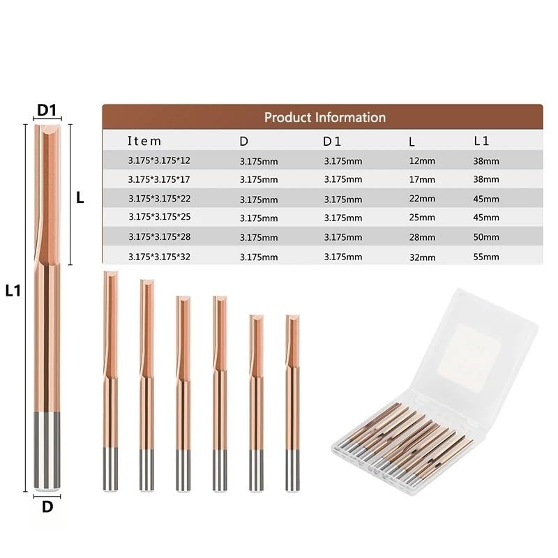 keyseat cutter10pcs CNC Router Bit Straight Milling CutterMaterial: CarbideCoating: Titanium coatedFlute: 2Shank: 3.175mmCutting Length:12mm 17mm 22mm 25mm 28mm 32mmApplication: Suitable for processingWood MDF Acrylic Pvc Plywood.Package Including:10pcs 2 Flute Straight End Mill