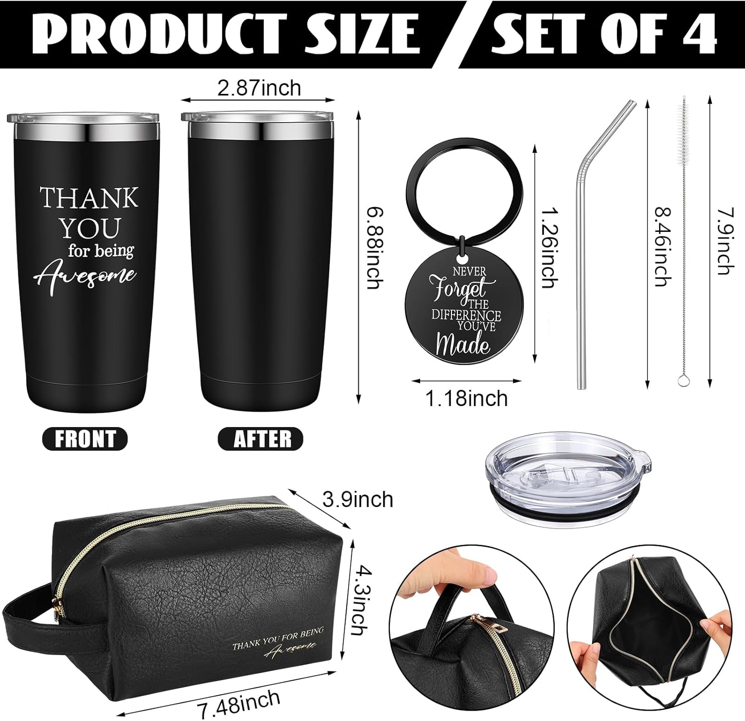Thank You Gift for Men 20 oz Stainless Steel Tumbler with Lid Leather Toiletry Bag Inspirational Keychain Employee Appreciation Gift Set for Dad Coworker Fathers Day Husband Male Friends Staff Features: Ideal Gifts For Most People: Leather toiletry bags, tumblers and keychains are printed with meaningful words, which can bring encouragement to the user, very suitable for graduation, Father's Day, Thanksgiving, etc. They are ideal birthday gifts, employee appreciation gifts, and thank you gifts. Unique Design: The tumbler adopts the classic wood grain design and is printed with four different inspirational quotes, which can motivate users very well, the inspirational quotes on the travel bag adopt the gold stamping design, which is advanced and beautiful, the inspirational keychain adopts laser printing technology and is not easy to scratch. Specifications: Color: Black Material: Stainless steel / Leather Leather Toiletry Bag Size: 7.48 x 4.3 x 3.9 inch Stainless Steel Tumbler Size: 7.48 x 4.3 x 3.9 inch Package includes: 4 x 20 oz Stainless Steel Tumbler 4 x Leather Toiletry Bag 4 x Inspirational Keychain Note: The colors may exist slight difference due to different screens. Manual measurement, please allow slight errors on size.