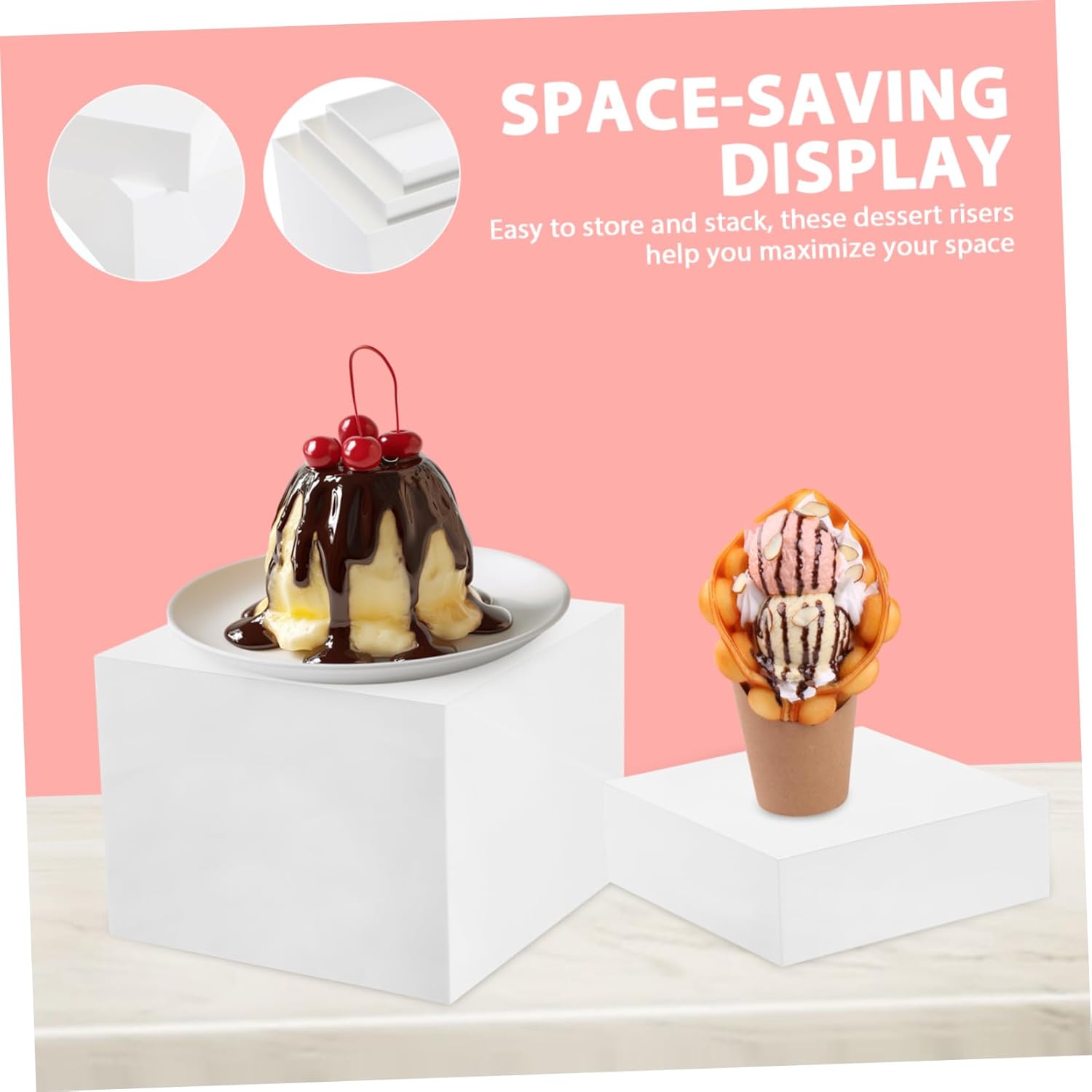 Package Include 1 x display riser small 1 x display riser medium 1 x display riser large Features -Material:Acrylic buffet riser -Size: 15.50X15.50X5.50cm/6.09X6.09X2.16in 20.50X20.50X15.50cm/8.06X8.06X6.09in 18.00X18.00X10.50cm/7.07X7.07X4.13in cupcake risers - Versatile usage: Designed for multiple uses, these display risers can be used as food risers for buffets, display stands for figures, or elegant holders for perfume bottles buffet display stands - Cubic design: The clean, cubic shape of these food risers provides a modern and uncluttered look that complements any setting, whether it's a buffet table or a display shelf dessert risers - Enhanced stability: Built with stability in mind, these display stands remain secure whatever you place on them, reducing the risk of tipping or damage risers display stands -Color:White food display holder - Ease of use: Their simple design makes them easy to assemble and use, requiring no additional tools or complex setup, allowing you to freely adjust the arrangement perfume stand - Aesthetic appeal: The minimalist style of these display risers enhance the appearance of the items displayed on them without detracting from the items themselves buffet display risersGoods Descriptionperfume organizer With their clean, cubic shape, these risers can also double as elegant displays for figures, perfumes and many other items.action figure riser Elevate your food presentation with our cube risers.buffet food stands These versatile risers are designed to add height and dimension to your buffet table, making it easier for guests to access and admire your culinary creations