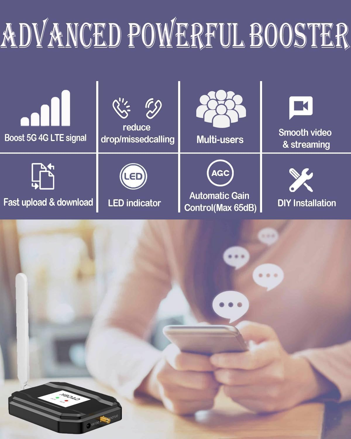 BuiltIn Media AT&T cell phone signal booster boost the signal up to 100X for AT&T T-Mobile U.S. Cellular Cricket Straight Talk for 4G LTE 5G on Band 12 and band 17 compatible with all 5G phones, provide crystal clear call and higher audio quality, reduces dropped calls, Improves cell reception, signal strength and data transfer speed, ATT Cell phone booster long-lasting coverage for metal building, metal roof, basement, garage, cabin, village, weak signal area, Max gain 65dB.