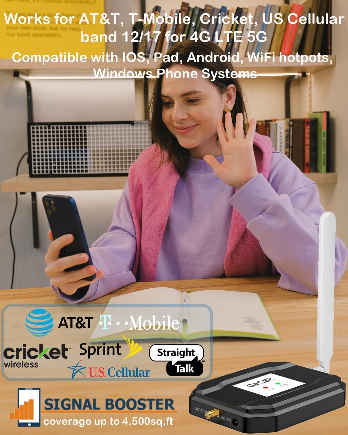 • Cell Phone Signal Booster: AT&T cell phone signal booster works with AT&T, T-Mobile, Straight Talk, Cricket, U.S. Cellular and more, at&t cell phone booster works on band 12, band 17 (700MHz), ready for 5G, also for 4G LTE 3G. Support frequency range: Downlink: 728-746MHz, Uplink: 698-716MHz. at&t signal booster provide crystal clear voice, Reduce dropped call, improve your signal from at least 1-2 bar to 3-5 bar up to 4500 square more than 2-5 rooms.