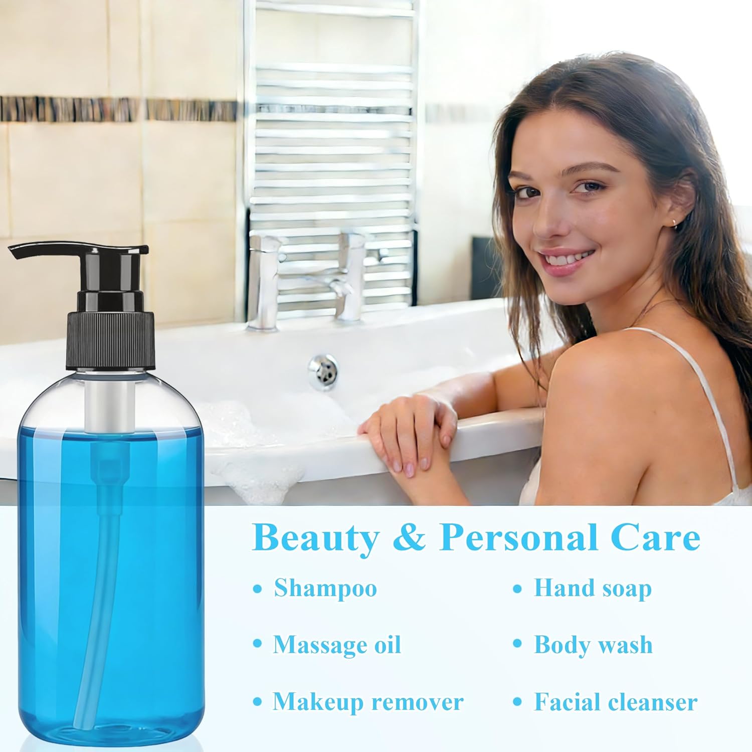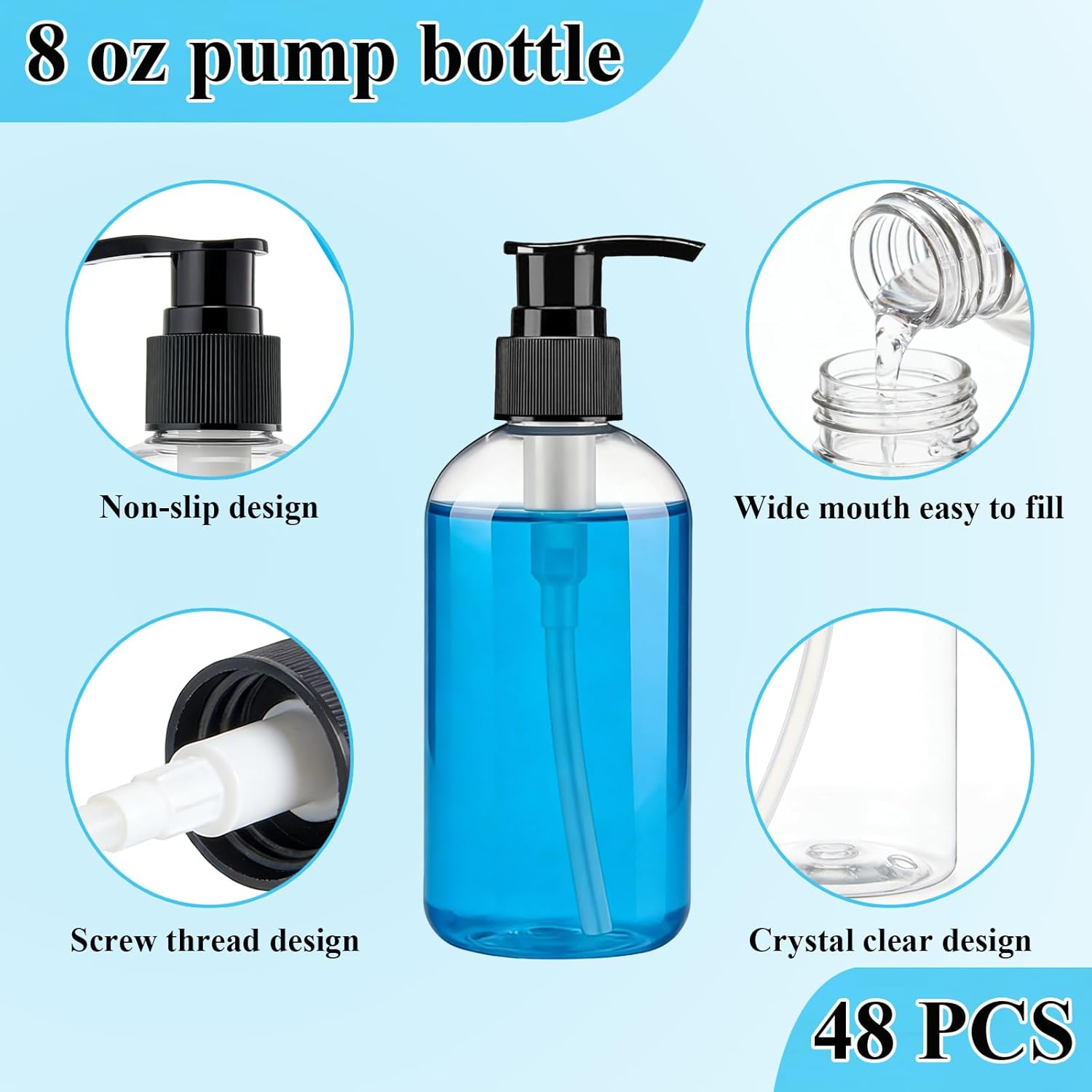 Keep your liquid essentials organized and within reach with this bulk pack of 48 clear plastic pump dispenser bottles from RONIMAN. Each 8 oz cylindrical bottle measures 2.2 x 2.2 x 6 inches, making them compact enough for countertops, shower shelves, and travel bags alike. The smooth-dispensing pump mechanism is ideal for shampoo, body wash, lotion, liquid hand soap, and essential oils, giving you precise control over every use. Crafted from BPA-free plastic, these refillable containers are a smart choice for home, salon, or commercial settings. The clear design lets you monitor product levels at a glance, so you never run out unexpectedly. Whether you're stocking up a bathroom, setting up a hospitality suite, or organizing a busy kitchen, this generous 48-piece set has you covered. Refill them again and again with your favorite products to keep dispensers full and routines running smoothly. A practical, versatile solution for anyone looking to stay organized in bulk.