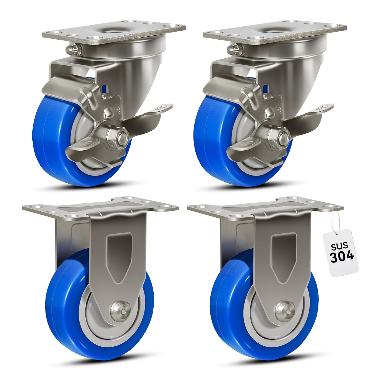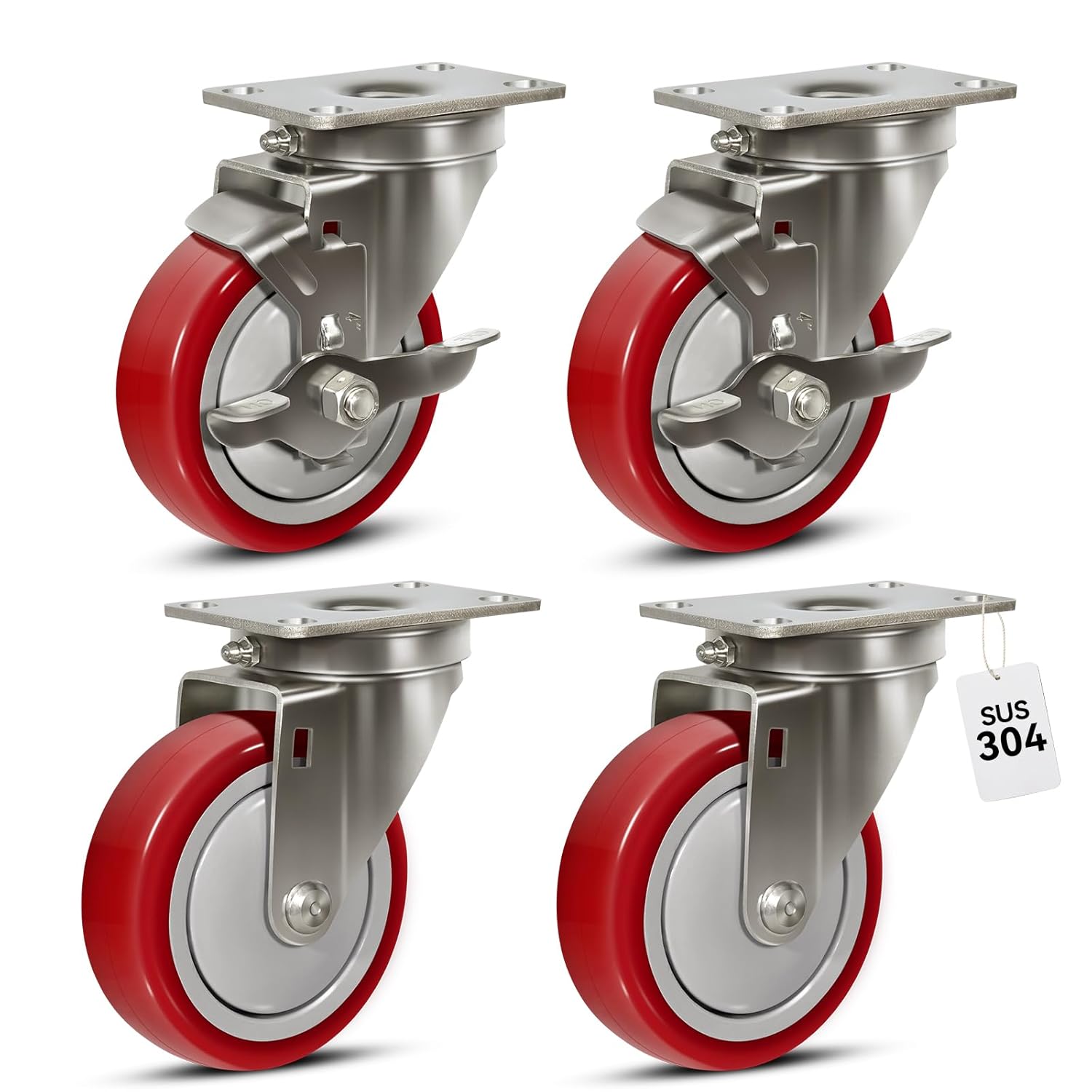 5" Caster Wheels, Stainless Steel Casters Set of 4 Heavy Duty, Anti-Corrosion Polyurethane Industrial Caster Wheels for Cart (2 Brake& 2 Rigid)