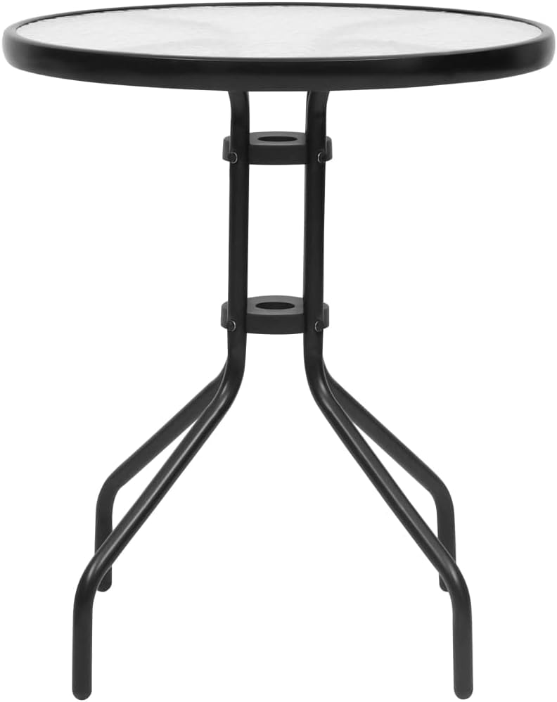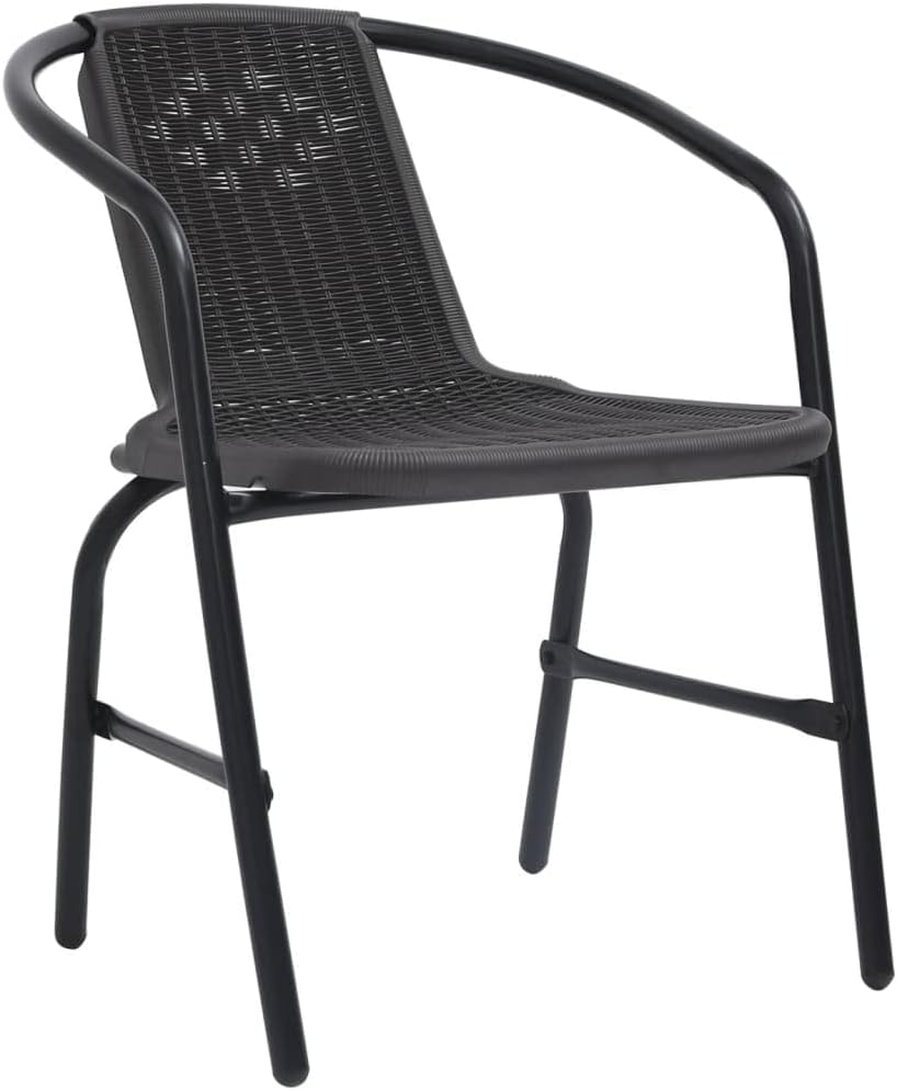 This patio dining set is ideal to have meal or enjoy an afternoon tea with your friends!Featuring steel frame, the garden table and chairs are very sturdy and durable. The tabletop is made of thick tempered glass, making it easy to clean. The plastic rattan seats add to seating comfort. Additionally, the armchairs are stackable to save space when not in use.Note: In order to extend the life of your outdoor furniture, we recommend you to clean it regularly and do not leave it outdoors without protection unnecessarily.Clean: Use a mild soap solutionStoring: If possible, store in a cool, dry place indoors. If the product is stored outdoors, protect it with a waterproof cover. Wipe and dry the excess water or snow from flat surfaces after a rain or snowfall. Allow sufficient air circulation to avoid moisture-related damage.Table:Color: BlackMaterial: Steel, tempered glassDimensions: 23.6" x 27.6" (Dia. x H)Tempered glass thickness: 0.2"Chair:Color: BlackMaterial: Plastic rattan, steelDimensions: 24.4" x 21.6" x 29.1" (W x D x H)Maximum loading capacity: 242.5 lbAssembly required: YesDelivery contains:1 x Table4 x Chair