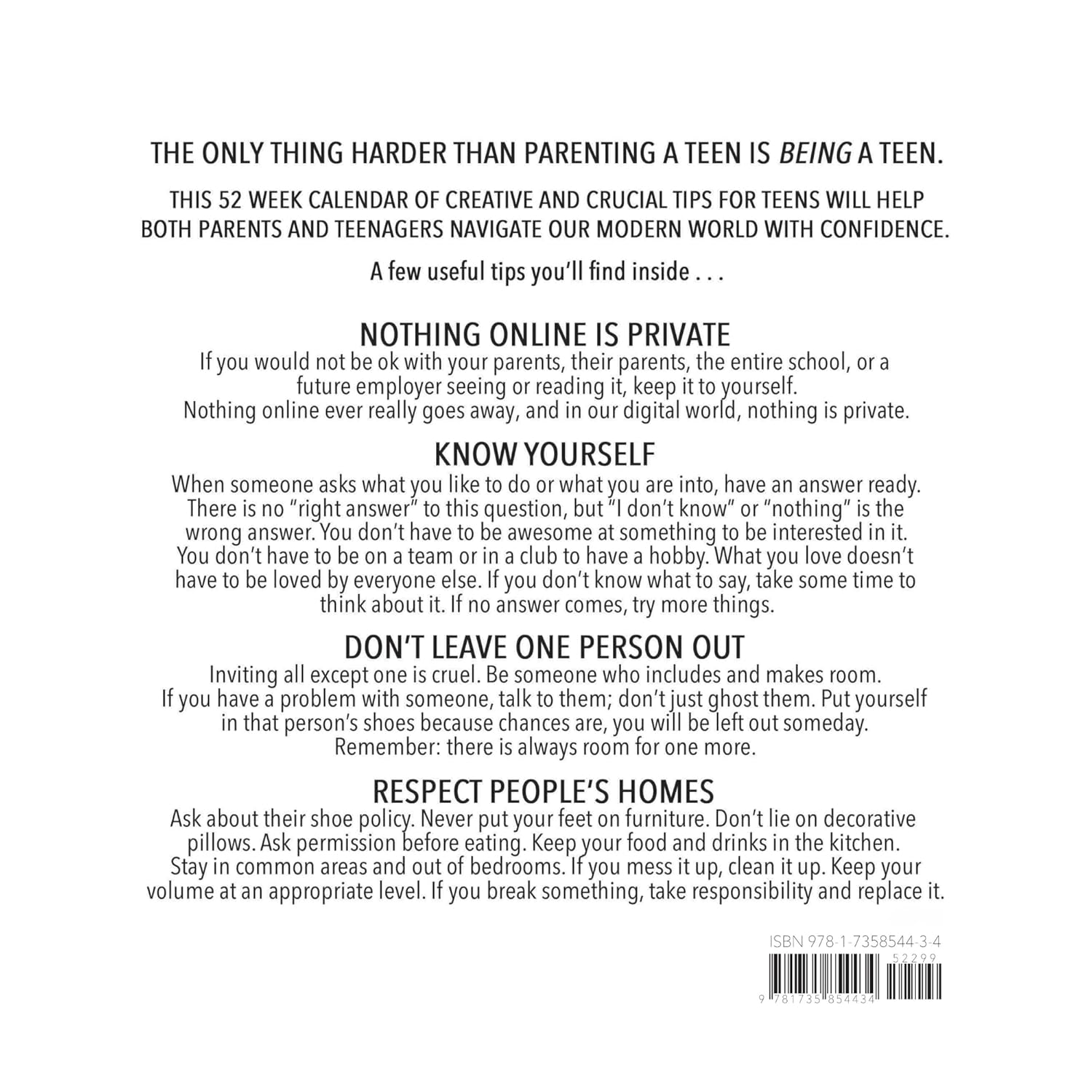 A Practical, No-Lectures Guide to Social Confidence, Respect, and Real-World SkillsRaising teens is a challenge. One minute they’re funny and charming, the next they’re moody, distracted, or glued to their screens. You want them to succeed, to connect with family and friends, to feel confident in social situations—but teaching them the small things that make a big difference often feels impossible.52 Modern Manners for Today’s Teens is designed for this exact problem. This book isn’t about formal etiquette or outdated “do’s and don’ts.” It’s about the skills that really matter today: social awareness, respect, confidence, teamwork, and digital responsibility. These are the lessons that help teens thrive in a world that’s more connected, more digital, and often more complicated than it used to be.Teens may resist learning. They may roll their eyes or push back. That’s normal. This book works differently. It teaches through a stand-up flip calendar format, where each page presents one clear, actionable manner on the front and explains the “why” and practical steps on the back. Place it on a desk, countertop, or bedside table and let teens engage naturally, week by week, at their own pace.What makes it so effective:Relevant lessons for real life: Teens learn about digital safety, personal hygiene, inclusion, teamwork, and everyday social skills.Short, direct, and memorable: Lessons are designed to stick without feeling overwhelming or preachy.Independent learning: Teens can explore the lessons on their own, reducing tension and eye-rolling.Visual and interactive: The calendar-style design keeps lessons visible and top-of-mind all week. Some of the key manners included are:“Nothing online is private” – staying safe and mindful online.“The way you smell matters” – small habits with big social impact.“Don’t leave just one person out” – promoting empathy and kindness.“Pitch in” – understanding contribution, teamwork, and responsibility.“Introduce yourself” – gaining confidence in social interactions. These are just a few of the 52 powerful lessons that have already helped over 100,000 families and classrooms. Parents report smoother family interactions and more respectful communication. Teachers and educators find it an invaluable tool for guiding students toward better social awareness and stronger interpersonal skills.Who benefits: Teens ages 11 and up, whether shy, outgoing, or somewhere in between. Ideal for families, classrooms, or independent learning, it’s a resource that grows with your teen and provides meaningful guidance at every stage of social development.Why this book works:Teens gain confidence without feeling pressured.Lessons are actionable and meaningful in today’s world.Teaches digital responsibility, empathy, teamwork, and self-awareness.Encourages positive relationships at home, school, and online.Visual format reinforces daily learning and creates natural conversation starters. Looking for more? If you loved Volume 1, Volume 2 adds 52 all-new manners to continue building your teen’s social skills, confidence, and life success. Together, the two volumes provide two full years of practical, modern guidance for teens navigating school, friendships, family life, and online interactions.Teens don’t need another lecture—they need tools that make sense in their world, lessons they can see, understand, and apply every day. 52 Modern Manners for Today’s Teens gives them exactly that, helping teens develop confidence, respect, and real-world skills while making family life calmer, smoother, and more connected.Give your teen the chance to thrive socially, academically, and personally. Don’t wait—start seeing the difference that 52 simple, modern manners can make in your teen’s life. Read more