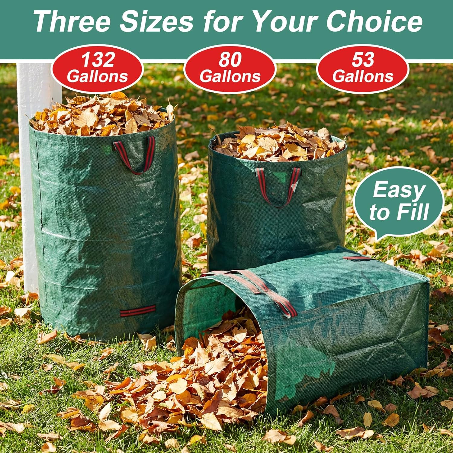 Features: The yard waste bags feature a reinforced double bottom that adds extra durability, ensuring the bags can handle rigorous use in various conditions, from damp grass to rough terrain. The leaf collector has a reinforced woven handles. Even when fully loaded, you can easily move and transport the garden bag. It greatly saves physical strength. Specifications: Material: polypropylene (pp) Color: green Size: Standing bags: 500 L/ 132 gallon and 300 L/ 80 gallon Dustpan bags: 53 gallon/ 200 L Package includes: 6 x Reusable yard waste bags Notes: Manual measurement, please allow slight errors on size. The color may exist a slight difference due to different screen displays