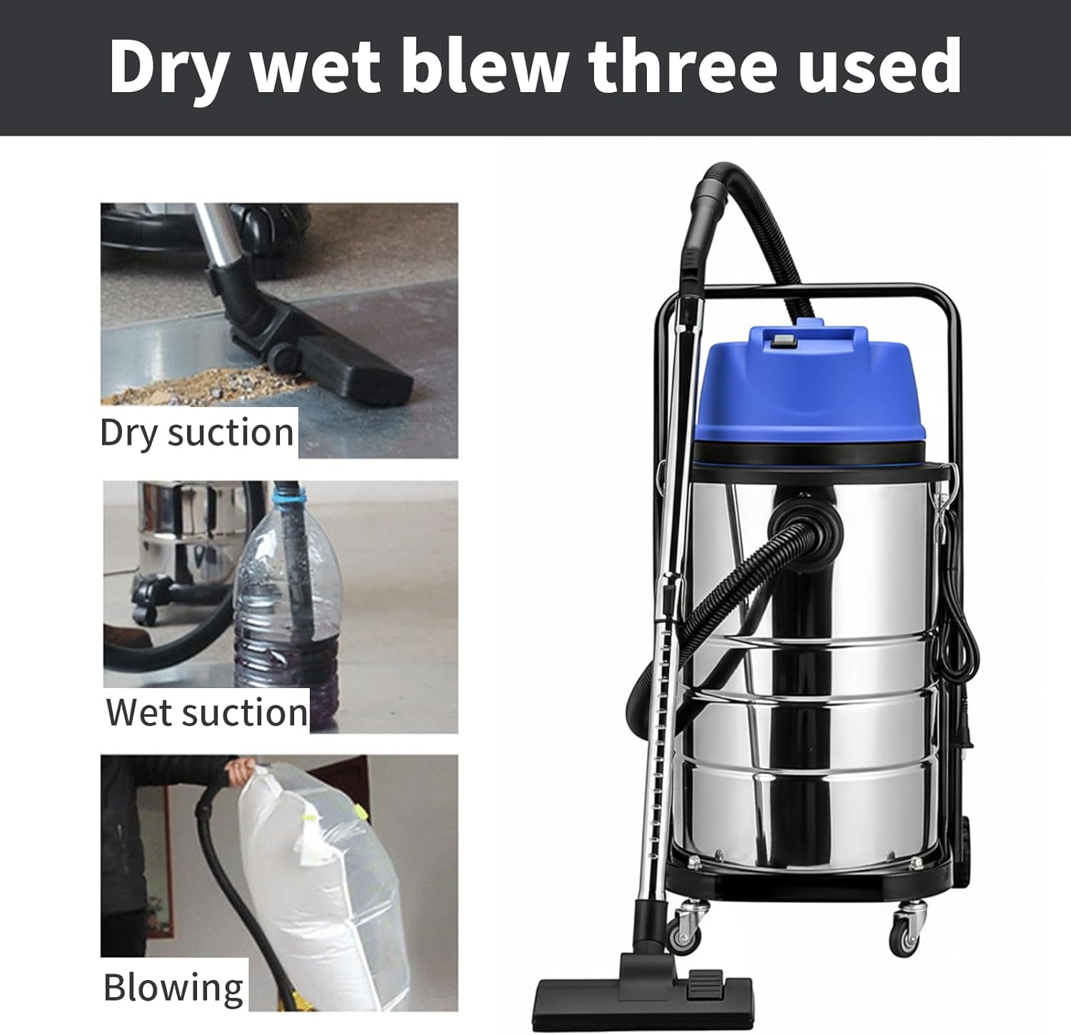 Ever tired of switching between appliances for different messes? Meet our ultimate cleaning powerhouse! ● This incredible 1400W Motor Dry/Wet Vac effortlessly handles debris, and even liquid spills with remarkable suction power. ● Its generous 60L capacity means you can clean longer without constant interruptions. ● Complete with specialized brushes for every surface—from floors and sofas to your car interior—it’s the only tool you need to keep your entire space immaculate. ● The extended power cord and quiet make cleaning a breeze. Transform how you clean today!Specifications:Name: Wet/Dry Vacuum CleanerRated Voltage: 110V / 240VRated Frequency: 50Hz / 60HzRated Power: 1400WCapacity: 60LVacuum Level: 20kPaNoise: Less than 80dBPower Cord Length: 4mSpecialized Nozzle: Two-in-One Wiping and Suction BrushMaterial: Thickened Stainless Steel Barrel, EVA HoseFiltration System: Multiple Filtration and Purification OptionsPackaging:Vacuum Cleaner * 1Multi-Function Floor Brush * 1Flat Nozzle * 1Round Brush * 1Sofa Brush * 1Instruction Manual * 1Tips:Powerful Motor (We recommend taking a 15-minute break after 2.5 hours of continuous use to extend the life of the unit)Customer Service:If you have any questions after receiving the package, please contact us as soon as possible, we will always give you a satisfactory answer.