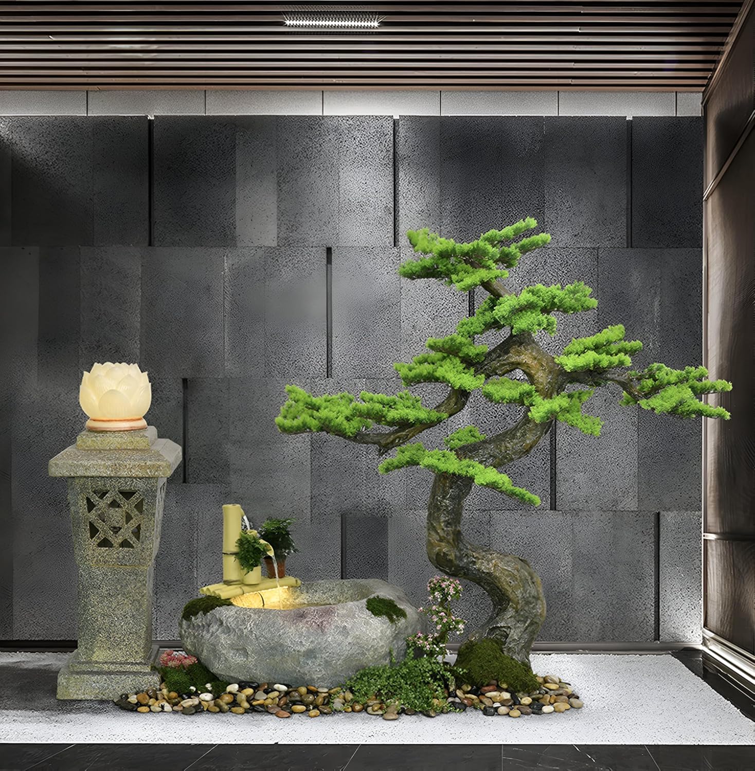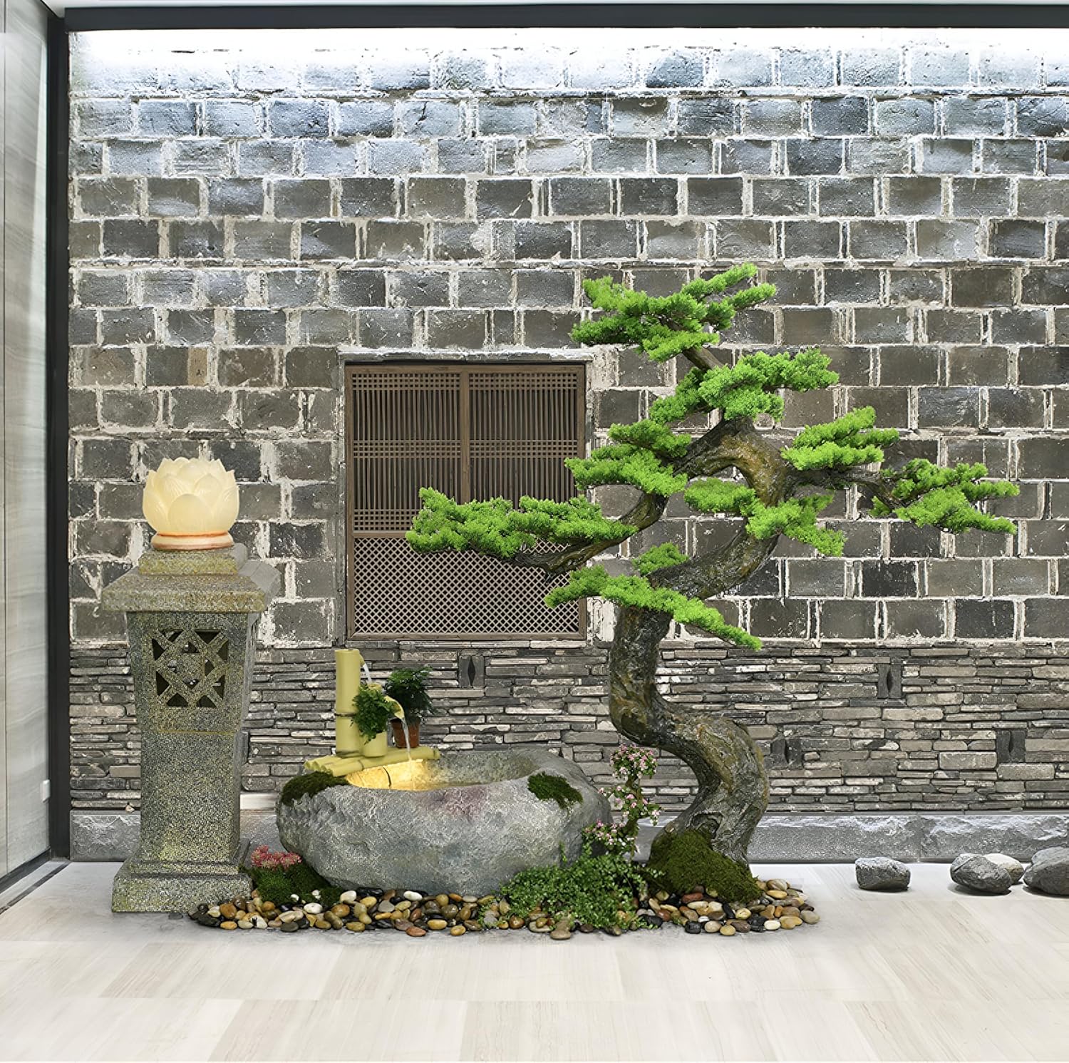 This freestanding Chinese wigwam fountain ornament combines the elements of lighthouse, flowing stone trough, natural river stone and pale pine, which is an ideal decorative choice for courtyard, clubhouse, entrance hall, etc. It shows a strong Chinese Zen style and creates a serene and peaceful atmosphere. The product size is exquisite: the lighthouse is 36×36×110CM, the stone trough is 80×80×56CM, and the landscape tree is 110×30×140CM, the overall shape is harmonious and suitable for a variety of space arrangement needs. Product features include: silent running water pump provides smooth water flow, non-splash design to keep the environment clean; durable and colorfast high-quality materials to ensure long-term use; green plants and bonsai to add natural vitality to the decoration. Equipped with adjustable LED lights and variable frequency pump, users can easily adjust the light effect and water flow speed to flexibly adapt to the needs of various scenes. Whether as indoor or outdoor landscape decoration, or as a gift, this fountain can show taste and enhance the artistic style of the space.