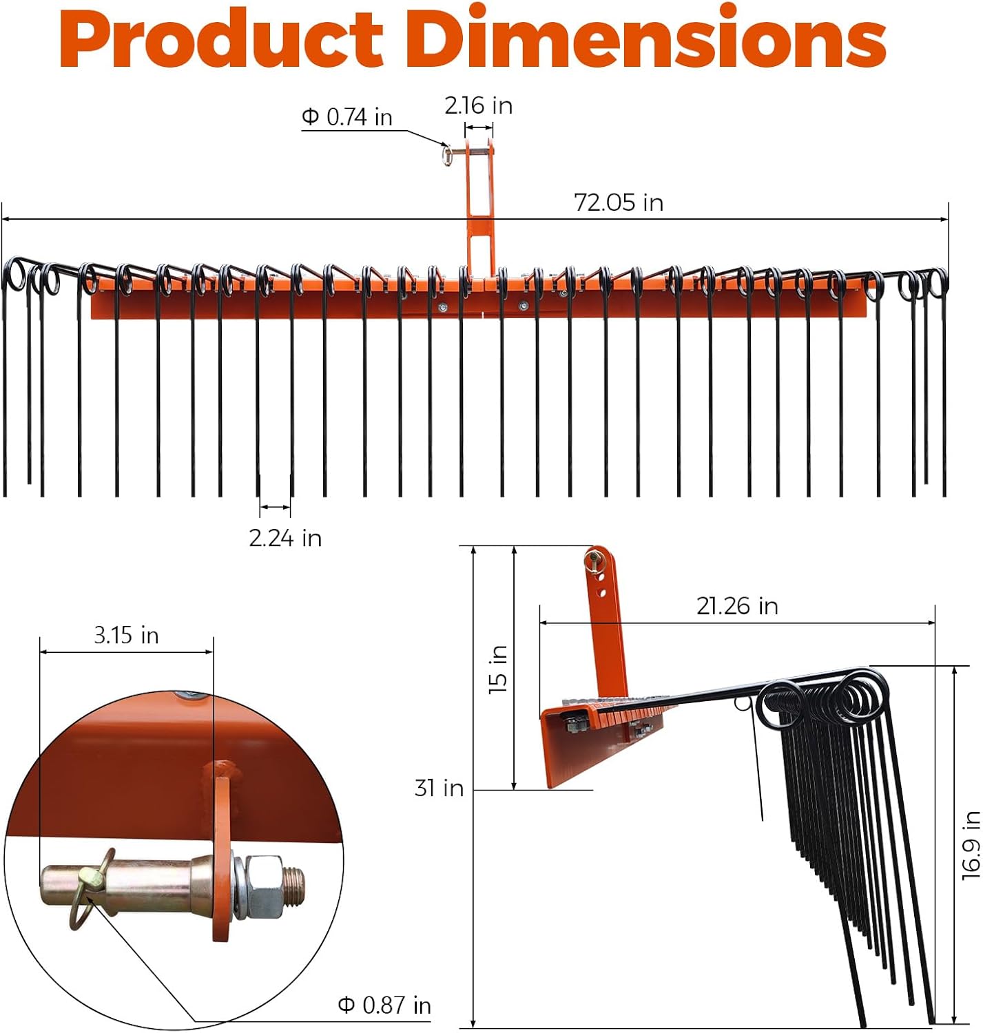 Product Name:Pine Straw RakeMain Material:Q235+ Spring SteelProduct Dimensions:72"W x 17"HItem Weight:88 PoundsProduct advantages:Perfect for property owners! This heavy-duty 72" tractor landscape rake features 30 spring tines, fits Cat 1 & 2 tractors, and efficiently clears pine straw, levels soil, and dethatches—all while resisting corrosion. A must-have for easy, professional landscaping!