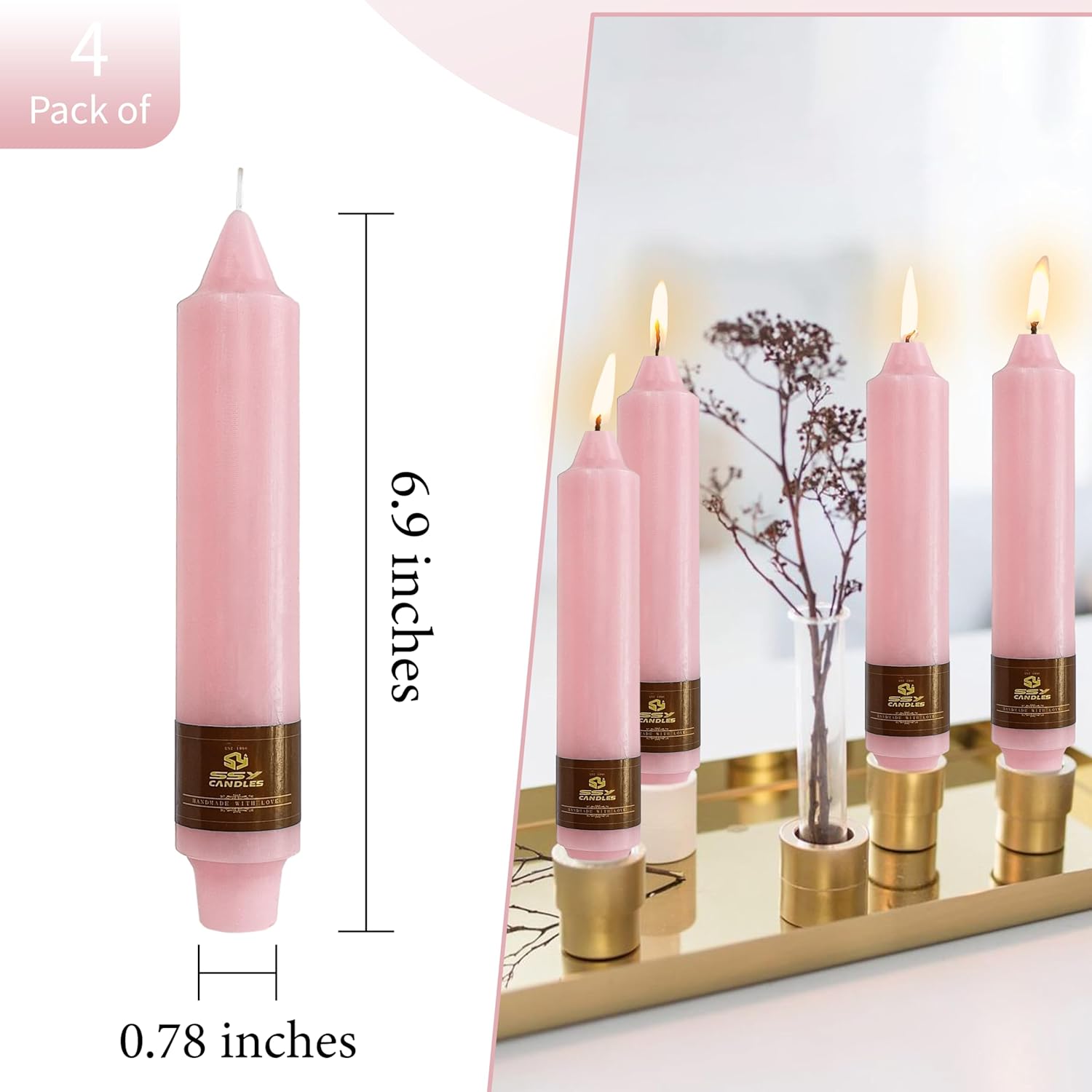 Elegant and simple, these handmade taper candles are perfect for parties and centerpieces. Their soft glow adds a warm ambiance to every occasion. Our candles are made in batches, so please allow some variations in color and size. These differences are a normal part of candle making. 【1】Before burning, always trim the wick to ¼ inch. 【2】When lighting a candle, use long matches or a long-reach lighter. 【3】Never leave a candle unattended. 【4】It is recommended that candles do not burn for longer than four hours and cool for at least two hours before relighting. 【5】Never burn a candle on or near anything that can catch fire. 【6】Keep candles out of the reach of children and pets. 【7】Never touch or move a candle while it is burning or while the wax is liquefied. 【8】Place burning candles at least three inches apart from one another. 【9】Extinguish a candle if the flame becomes too high or flickers repeatedly. Let the candle cool, trim the wick, and check for unwanted drafts before re-lighting. 【11】Use a candle snuffer to extinguish a candle. It’s the safest way to prevent hot wax from splattering.