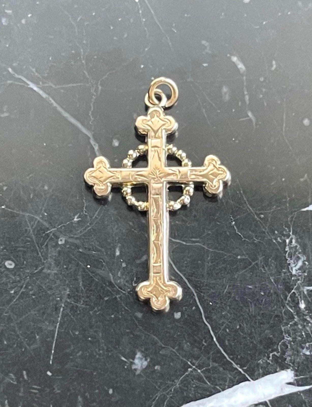 This exquisite 9k gold cross is the most ornate piece in our vintage collection. Crafted with intricate filigree detailing, a delicate beaded halo, and elegant stylized ends, it beautifully reflects the romantic artistry of the Art Deco era. The hand engraving has softly faded over time—a subtle and soulful reminder of how cherished this piece once was. A true heirloom-quality treasure, this one-of-a-kind pendant is as timeless as it is unique—perfect for those who appreciate antique charm with meaningful history.