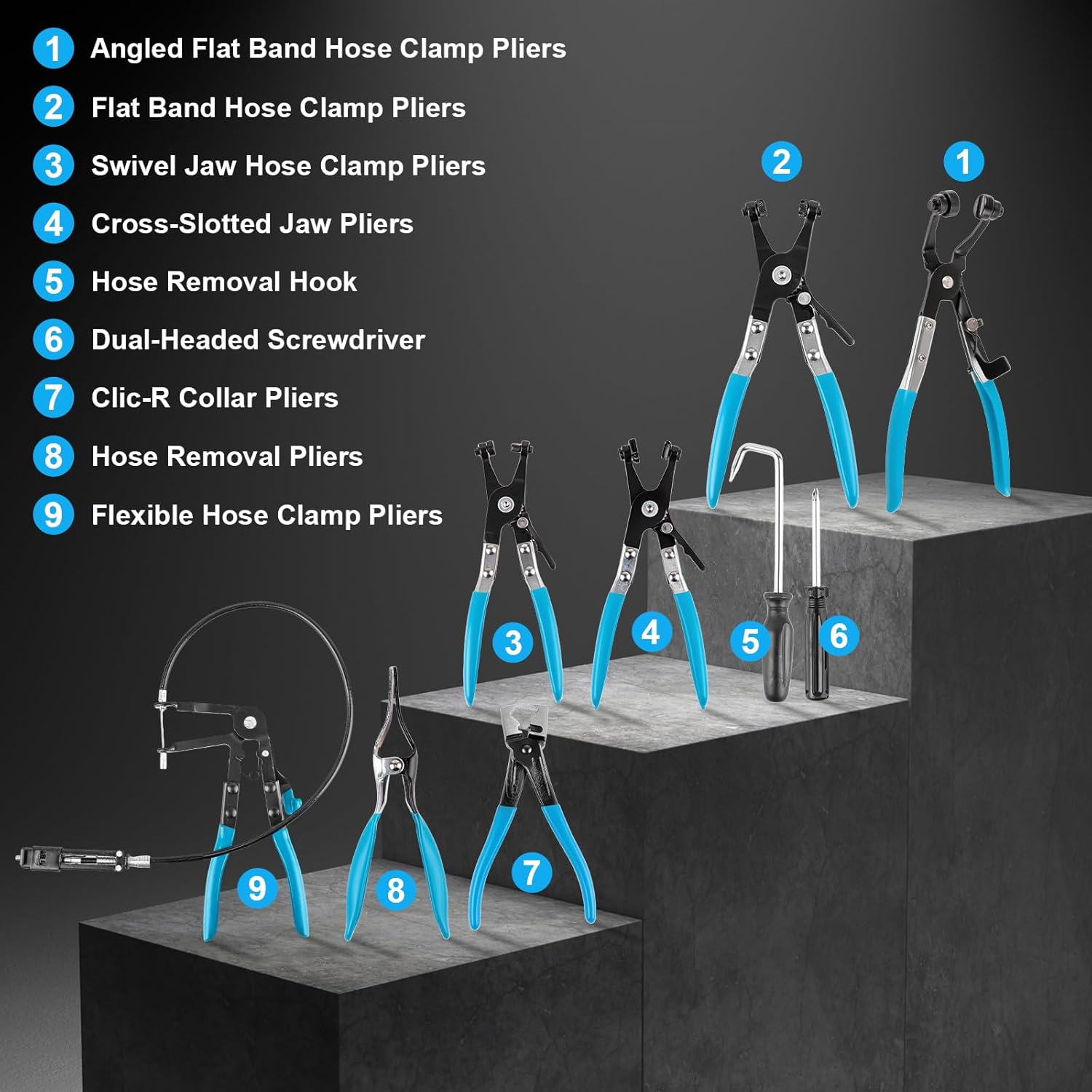 • 9-in-1 Professional Kit for Every Task: Our comprehensive 9-piece hose clamp plier set is your all-in-one solution. It includes a long-reach flexible cable plier, Clic-R type collar plier, swivel jaw band clip & spring wire clip pliers, regular and angled flat band pliers, hose removal pliers, a dual-headed screwdriver, and a handy hose hook to tackle any automotive clamp