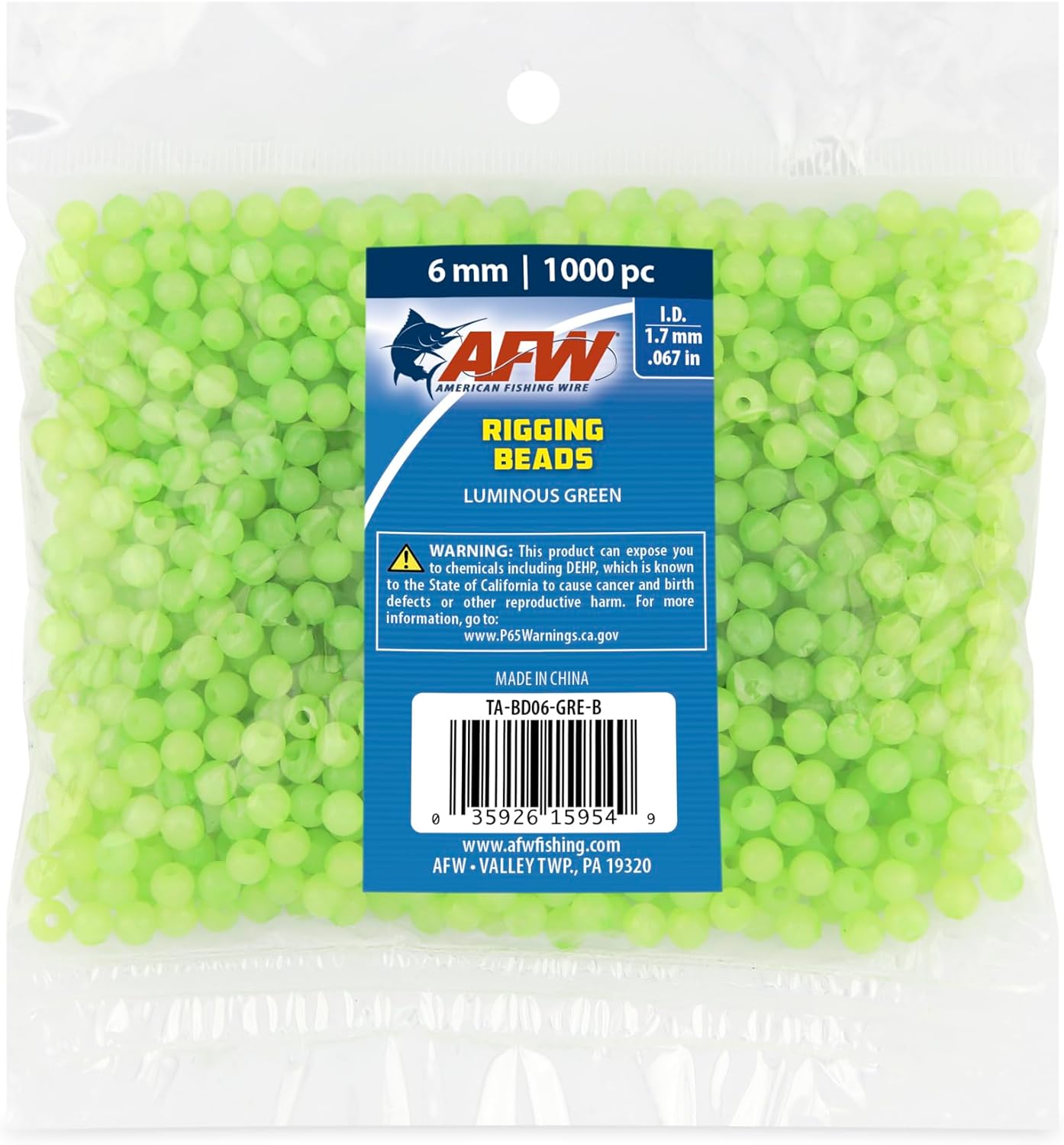 The AFW Rigging Round Beads are the perfect addition to any angler’s tackle box, offering both versatility and durability for creating fishing rigs. These round beads, available in 6mm and 8mm sizes, are essential for building reliable rigs for both saltwater and freshwater fishing applications. The beads are made from high-quality acrylic, ensuring long-lasting use and resistance to wear, making them ideal for both recreational and professional anglers. The luminescent green beads are especially effective for bottom rigs, as they enhance visibility in low-light conditions, drawing fish in for a more successful catch. For versatile applications, the red beads are a great choice, adding an attractive visual element to your rigs that works well in a wide range of fishing environments. Whether you're targeting catfish, offshore species, or other types of fish, these beads offer a reliable solution for your rigging needs. They fit perfectly on fishing line and are compatible with various types of fishing rigs, including bottom rigs, leader rigs, and more. These beads can also be used for catfishing rigs, ensuring that your setup stands out to attract more bites. Available in both 6mm and 8mm sizes, the AFW Rigging Round Beads allow you to customize your rigs according to your specific needs, whether you’re using them for freshwater or saltwater fishing. Their durable construction ensures that your rigs stay intact throughout your fishing trip, and their vibrant colors make them an excellent addition to any fishing setup. Ideal for anglers looking to improve their rigs and make them more effective, these beads are a must-have in your tackle box for both casual and professional fishing.