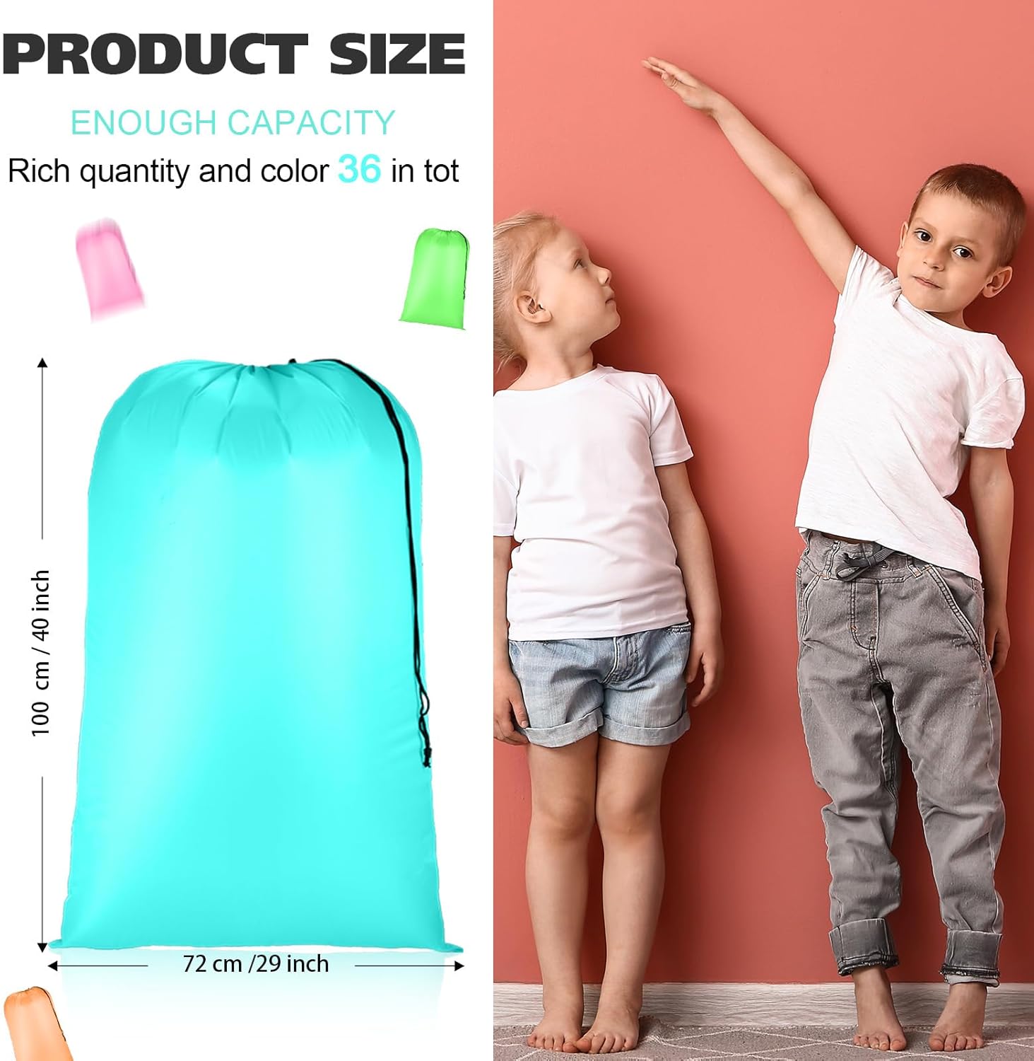 Feature: Convenient travel: Use a laundry bag with strap to help you keep your clothes organized. Our bag is made of tear resistant 210D oxford cloth and features a drawstring closure, suitable for road trips, camping and traveling. Multipurpose use: Better for summer camp, kids can store the week's dirty laundry, easily folds flat for future use. The laundry bag for dorm can also store your bedding, towels, out of season clothes, toys, blankets, pillows Specifications: Material: 210D oxford cloth Color: as the picture shows Size: about 29 x 40 inches Package include: 36 x Laundry bags Warm notes: Please allow slight size error due to manual measurement. The colors may exist slight difference due to different screen.