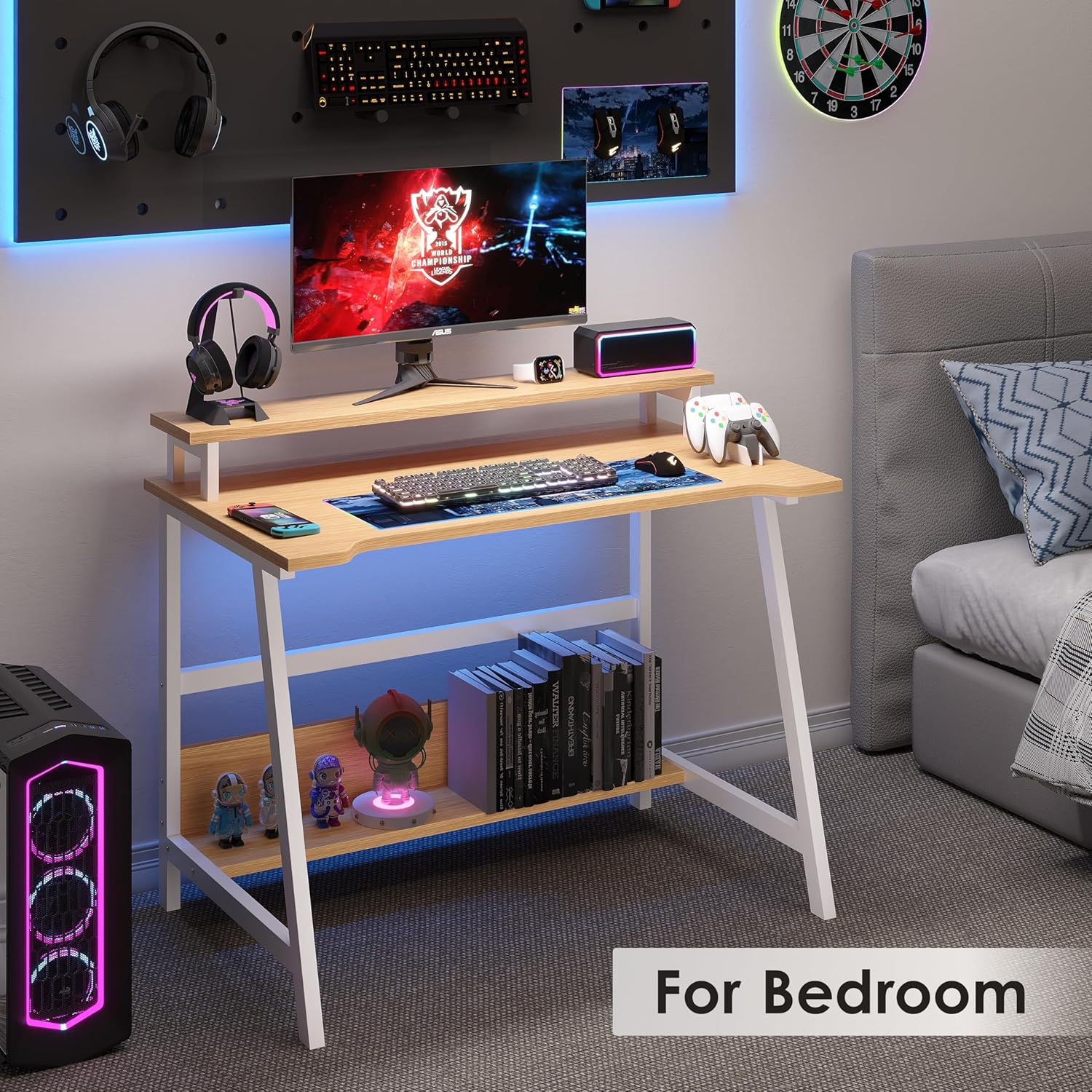 Desk is perfect for small apartment, bedroom or any other small corners.The elevated display stand effectively releases the desktop space, and keeps the display level with the line of sight, effectively adjusting the sitting posture