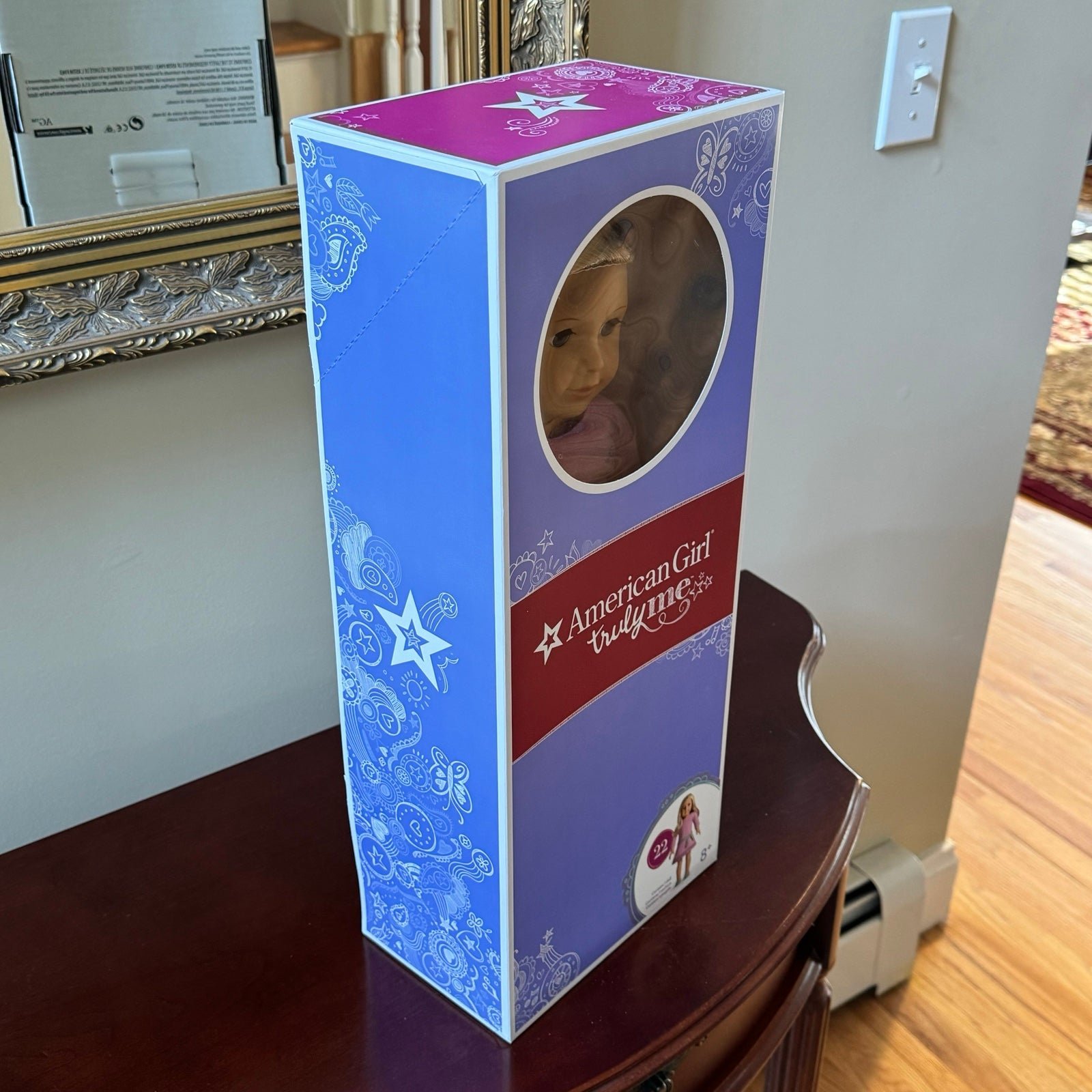 This purchase is for an American Girl Truly Me #22 doll. She has blue eyes, blonde hair, and light skin. She has a mark on one of her arms. Even though she has been removed from the box she has not been played with. Her hair net has never been removed. The price is firm but I bundle.