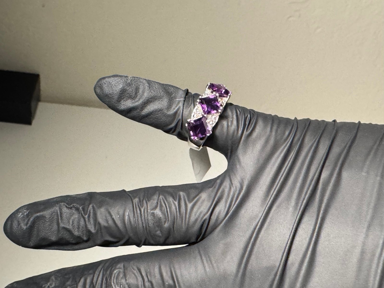 Introducing the Designer Women’s Sterling Silver Rhodium-Plated Ring with Amethyst and Topaz, a unique piece that combines sophistication, timeless style, and the powerful benefits of gemstones.