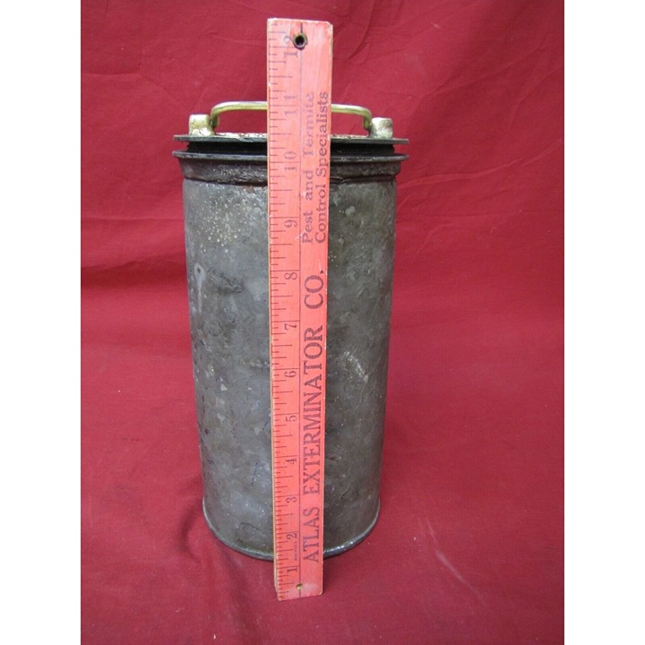 Brass screw on lid is embossed with raised letters, the can is free of rust,