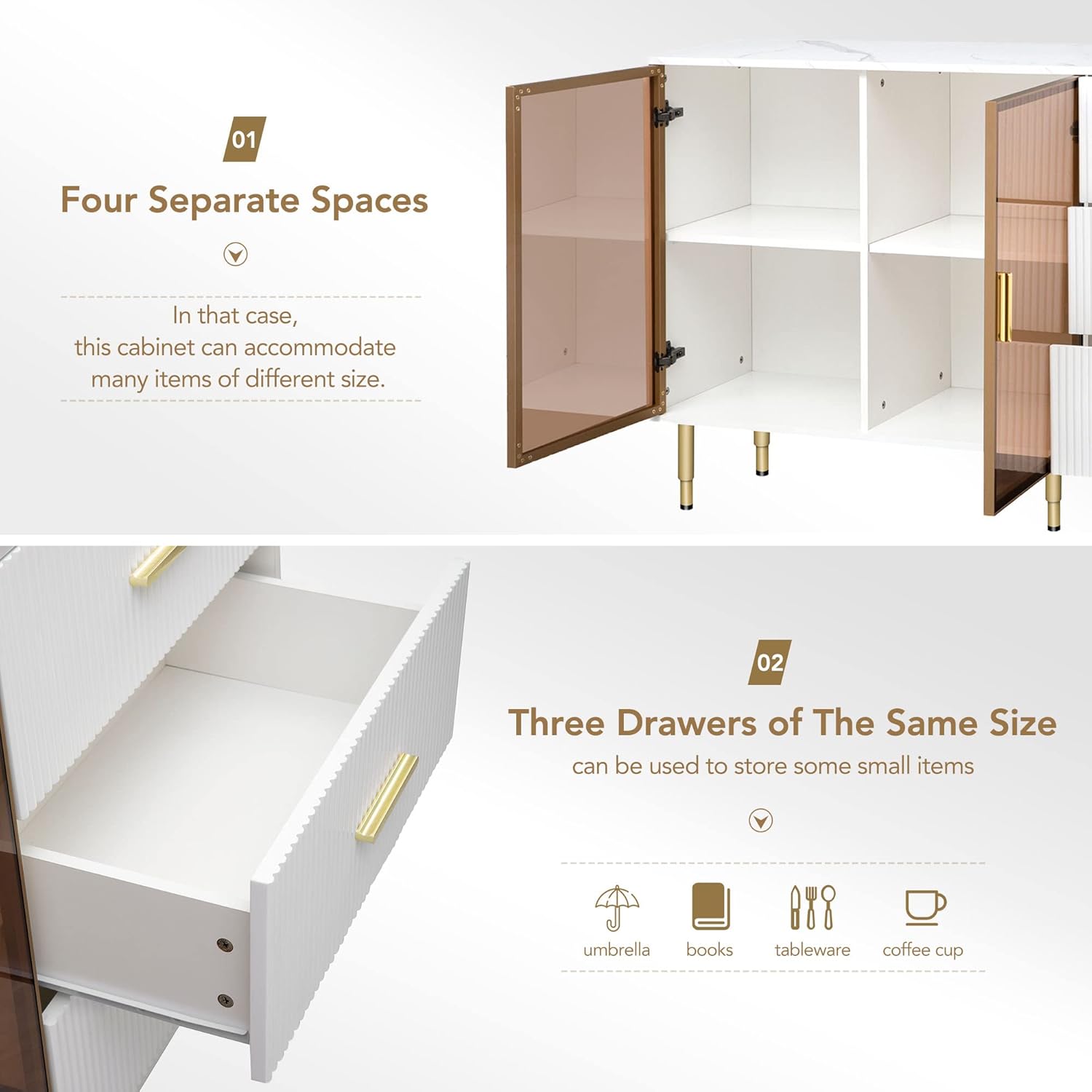 • [Buffet Cabinet with Storage] The left interior of the sideboard cabinet with tempered glass doors is divided into 4 separate compartments by shelves, which can be adjusted in height or removed to accommodate the storage needs of your different items. Additionally, the 3 drawers on the right are designed for effortless pushing and pulling, ideal for storing smaller items. This buffet sideboard is an excellent choice for storing cutlery, plates, wine bottles, and other items in a kitchen.