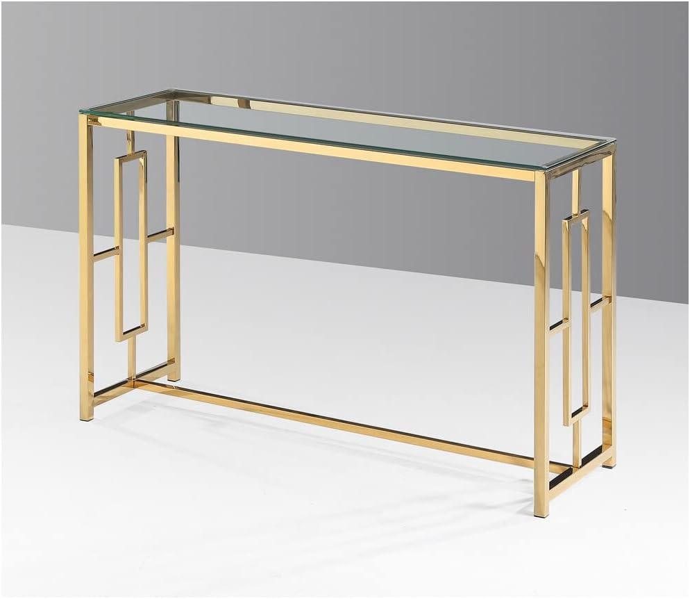 Use this metallic finish table to offer your family and guest a place to rest their drinks while relaxing in your living room. The stainless steel base and clear glass top gives this coffee table a more contemporary and elegant look. Specifications. Color Gold. Sofa Table 47 L x 16 W x 31 H. Weight 47 lbs