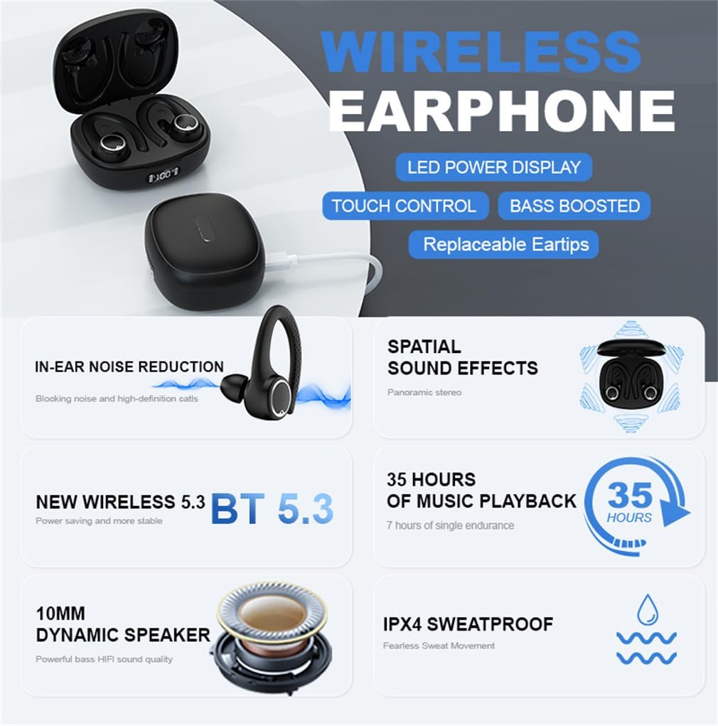 Unique Design Sports Earbud & In-ear Headphones*The Latest Bluetooth 5.3 - Stable Connection*Transmit lossless high-quality sound with low latency and offers extended range with fewer dropouts. Enjoy continuous.*Calls with Superior Clarity*Mic pick up your voice clearly and block out background noise. It's like you're really at the concert!*On-the-Go Listening*Small and lightweight for a comfortable fit, and the slim charging case easily fits in your pocket or gym bag.*Easy to Control*Both earbuds have a button that is simple to use, even mid-workout. Product Specifications:Bluetooth Version: 5.3Wireless Support Protocol: A2DP AVRCP/HFP/HSP/Operating Distance: >10 metresDriver Unit: 10mmImpedance: 32ΩSensitivity: 105±3dB SPL at 1kHzFrequency Response: 20~20,000HzBattery capacity: 40mAh per headphoneCharging case capacity: 400mahCharging time: 1 hour for headphones, 2 hours for charging caseMusic Time: 5.5 hoursColour: Black, WhiteProduct Listing:1 * Sports Wireless Earbud1 * Charging Box1 * Charging Cable2 * Replacement Silicone Earplugs1 * User ManualWhy choose our ear buds wireless?1. The headphones wireless bluetooth stay in the ears and are more comfortable than the ones with rubber tips.2. The case opens and closes easily. Also, the wireless earphones are easy to remove from the case.