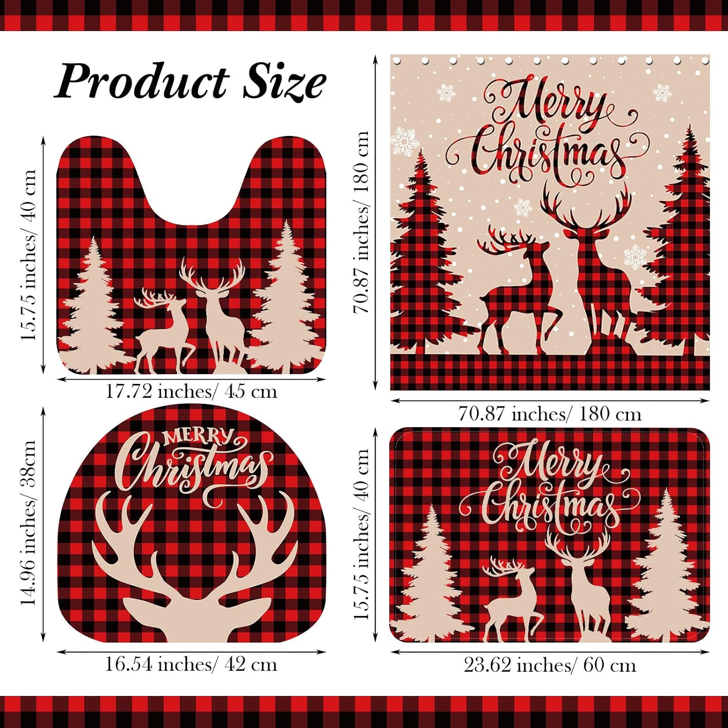 Features: Christmas bathroom decor choice: Celebrate the warmth of the festive season with our Christmas bathroom shower curtain set. A beautifully artistic accessory, our bathroom set says "Happy Holidays" in the most charming way possible. Merry Christmas: This remarkable set, cheerfully adorned with vibrant, holiday inspired designs, is your good companion for elevating your bathroom decor during this merry season. Each package includes 1 Xmas shower curtain, 1 non slip bathroom rug, 1 toilet lid cover, and 1 toilet contour mat. Sprinkle a touch of Christmas spirit into your everyday routine with our festive bathroom set, designed with joyous holiday elements. Specifications: Material: polyester, coral fleece Color: as the picture shows Size: Christmas curtain: 70.87 x 70.87 inches Christmas U toilet mat: 15.75 x 17.72 inches Christmas toilet lid cover: 16.54 x 14.96 inches Christmas bathroom mat: 15.75 x 23.62 inches Package includes: 1 x Bathroom curtain 1 x Toilet rug 1 x Toilet lid cover 1 x Bathroom mat 12 x Hooks Notices: Manual measurement, please allow slight errors on size. The color may exist a slight difference due to different screen displays. Machine washable in cold water with a gentle cycle. You can also cool iron it for added elegance. Tips: Do not bleach