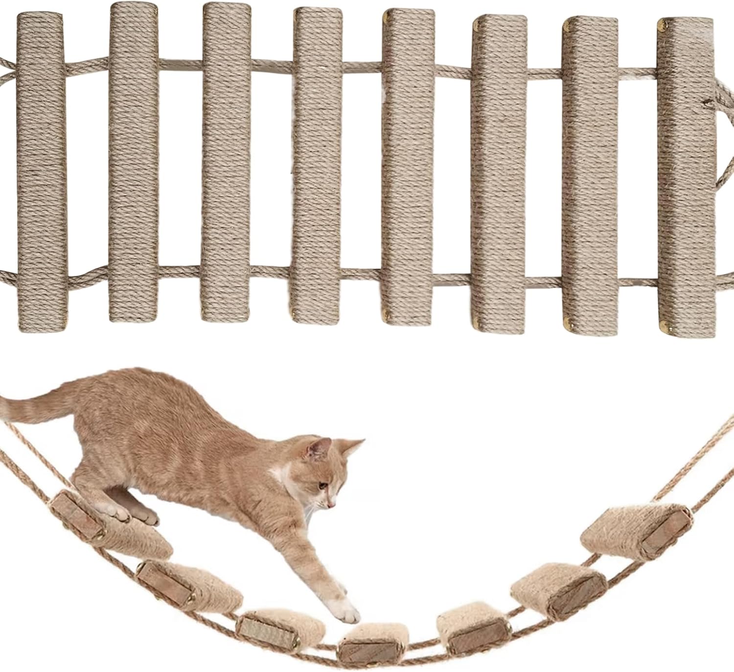 Description: Treat your feline friend to endless climbing fun with this 39-inch wall-mounted cat ladder. Made from natural hemp rope and wood, this climbing bridge provides a safe, secure, and stylish vertical playground. Features:. -Material: Hemp rope + wood. -Size: 100 cm/39.37 inch. Note: Manual measurement, please allow slight errors on size. The colors may exist slight difference due to different screens. Package Including 1 * Cat Ladder