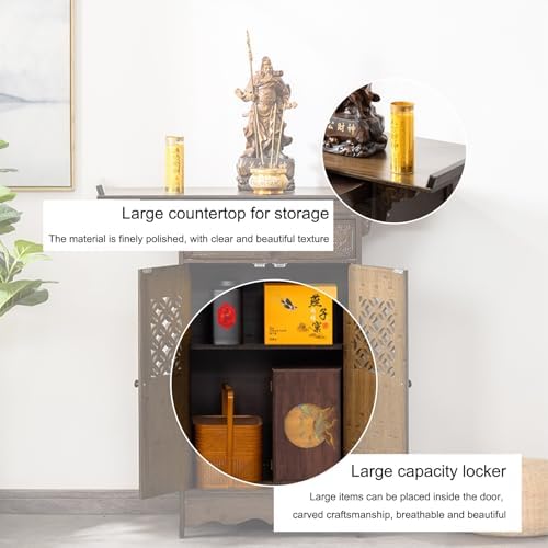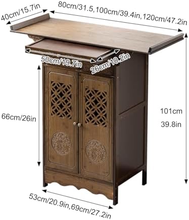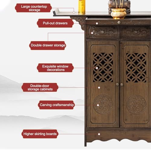 **Product Description** Elevate your space with our beautifully crafted Buddha table, designed with exquisite retro Chinese aesthetics. This versatile piece not only serves as an ideal Zen altar for your spiritual practices but also enhances the decor of any room. With its elegant design, it creates a serene atmosphere that complements your daily rituals while adding a touch of sophistication to your home. **Product Features** - **Artisan Craftsmanship**: Each table showcases meticulous carvings, reflecting the skill and dedication of our craftsmen. - **Functional Storage**: The thoughtfully designed pull-out drawers maximize storage space, allowing you to keep your essentials organized and easily accessible. When not in use, simply fold and stow them away. - **Spacious Cabinets**: Our large-capacity storage cabinets provide ample room for larger items. The breathable design ensures that your sacred items remain in great condition while adding to the table's aesthetic appeal. - **Elegant Design Elements**: The raised curved skirting board harmonizes with classical carvings, infusing your space with a rich, traditional charm. **Product Information** - Name: Chinese God of Wealth Altar Table/Buddha Table - Material: Solid Wood + MDF - Size Options: 66*40*101cm, 80*40*101cm, 100*40*101cm, 120*40*101cm - Installation: Some assembly required - Package Includes: 1 Altar Table Transform your home into a sanctuary with our Buddha table, where functionality meets beauty, making it a perfect addition to any meditation space or living area.