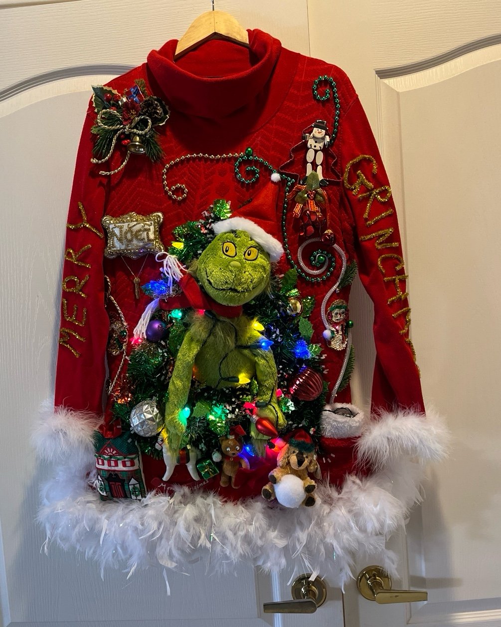 Christmas Party sweater -Ladies- This is a one of a kind UPCYCLED Tacky Ugly Christmas sweater made by Peck & Peck XL with Grinch on front coming out a Christmas tree & had Merry Grinchmas down arms. & on back- “THE END” printed with Grinch back end sticking out of the tree. Sweater that i have handcrafted for a Ugly Christmas sweater parties, unique sweater with feathers trimmings out the sleeves & waist ☺️