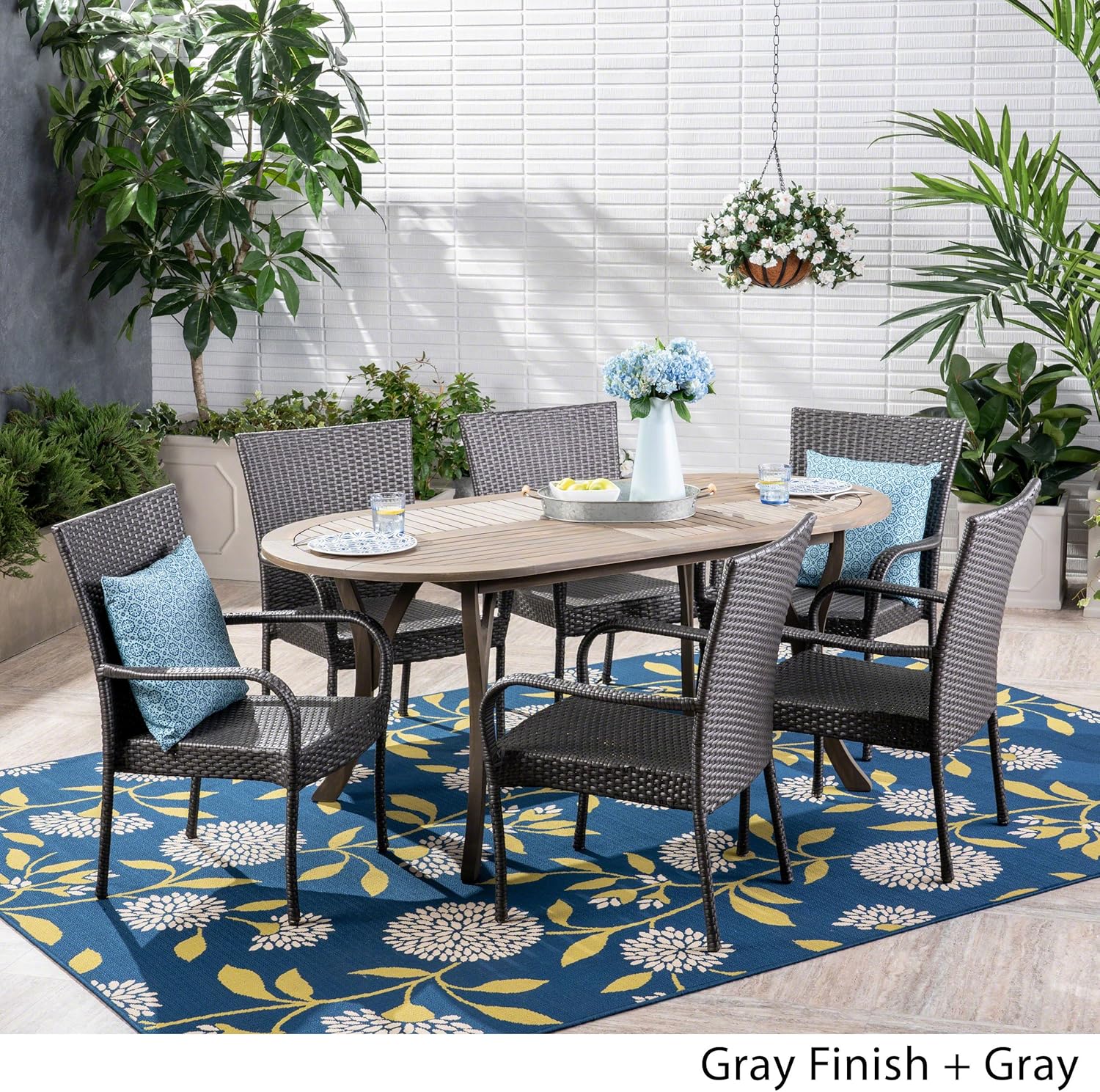 | Item Type Name | Ford Outdoor 7 Piece Wood and Wicker Dining Set, Gray Finish and Gray |