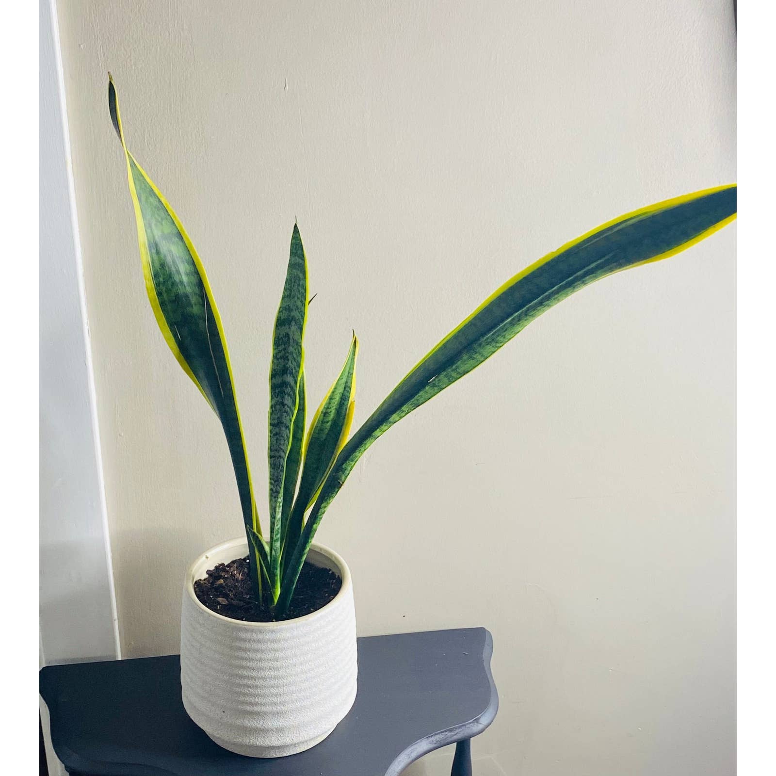 China is a Sansverieria Trifasciaita Laurentii aka Snake Plant. A succulent plant with upright sword-like leaves with yellow edges.