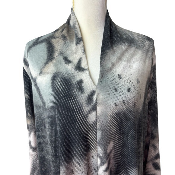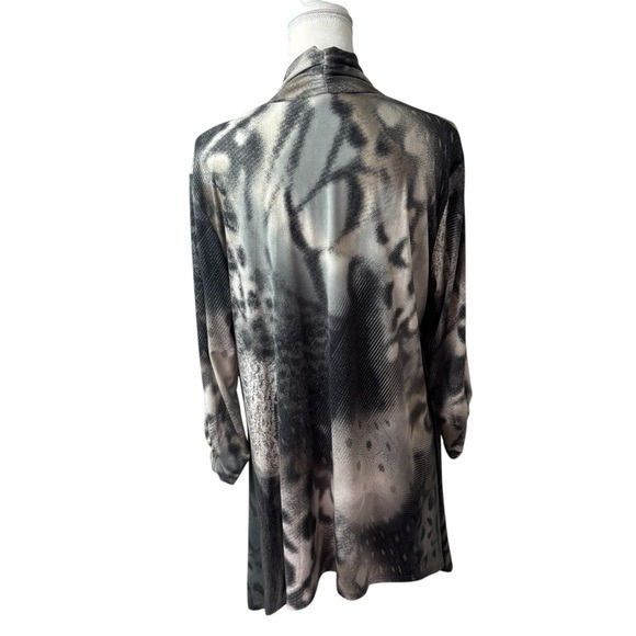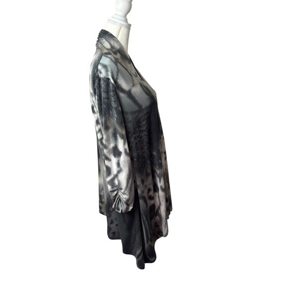 Stylish tunic with abstract pattern by Clara Sun Woo. Soft fabric. Neutral pattern with an almost animal print feel. Ruching on sleeve ends. Cute neckline on back. Effortless style. Perfect for any occasion. Made in the USA!