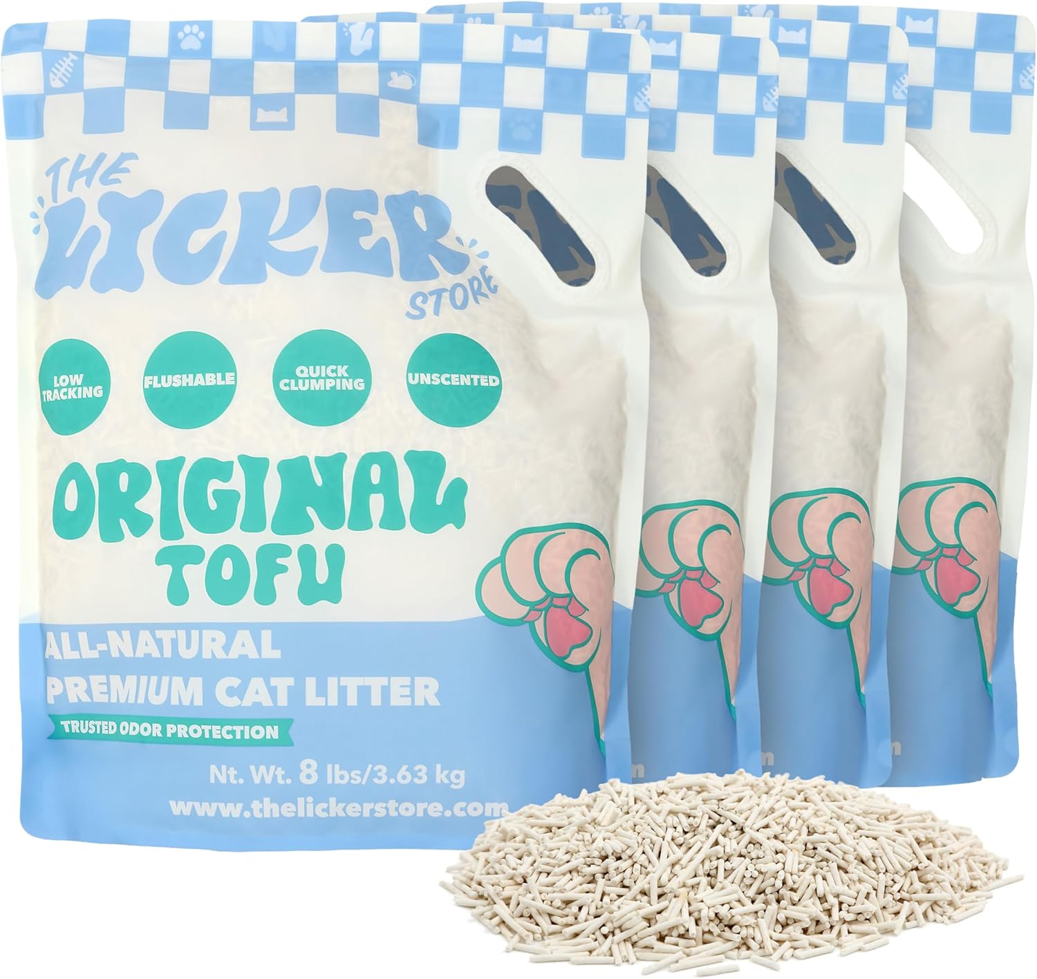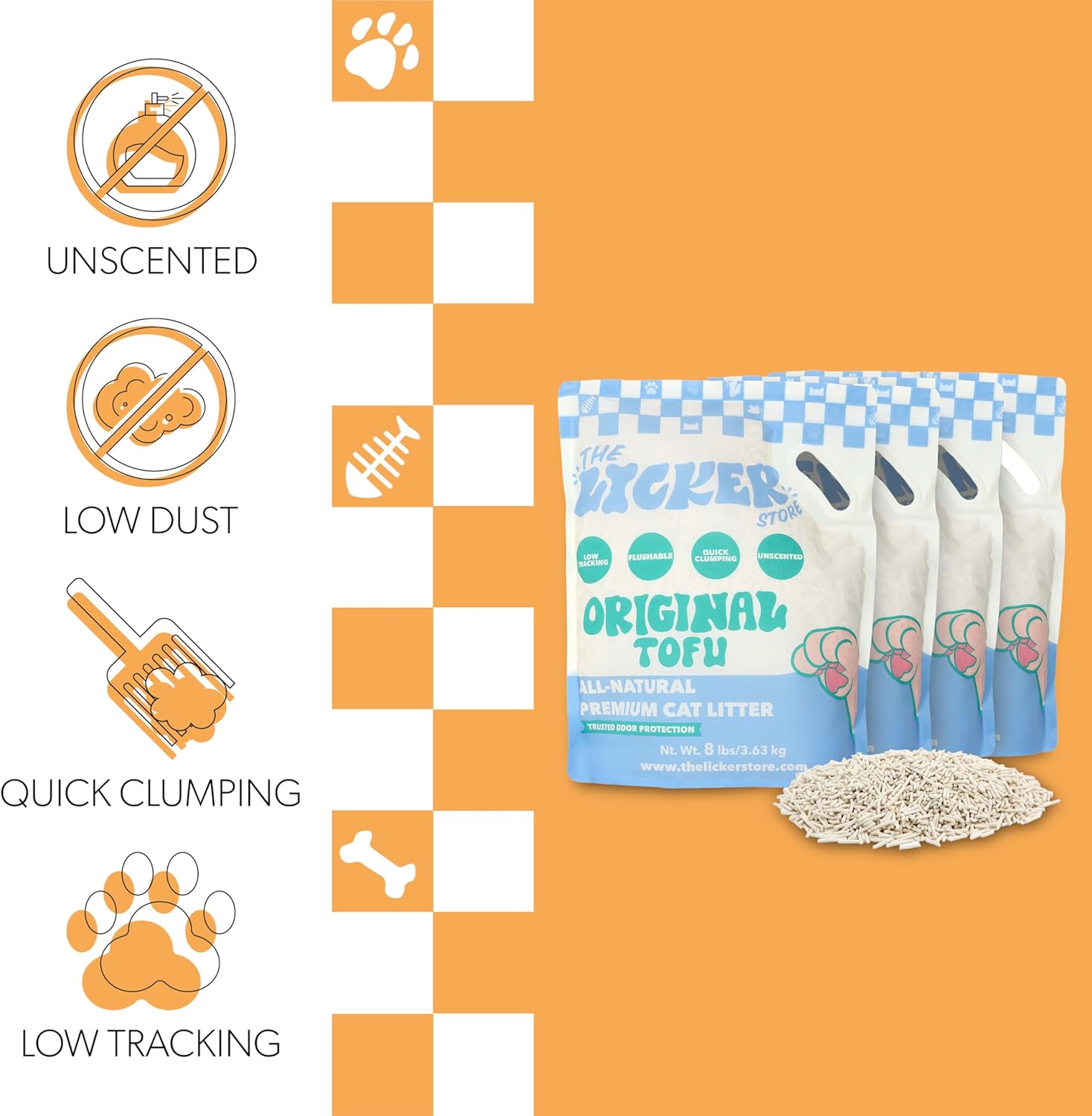 THE LICKER STORE Original Tofu Cat Litter is made from plant-based fibers that quickly form tight clumps for easy scooping and reliable odor control. Its low-dust, low-tracking, unscented formula helps keep paws, floors, and litter boxes cleaner, making it ideal for sensitive cats and everyday use. Small clumps may be flushed via toilet where permitted, offering a convenient alternative to traditional clay litter.