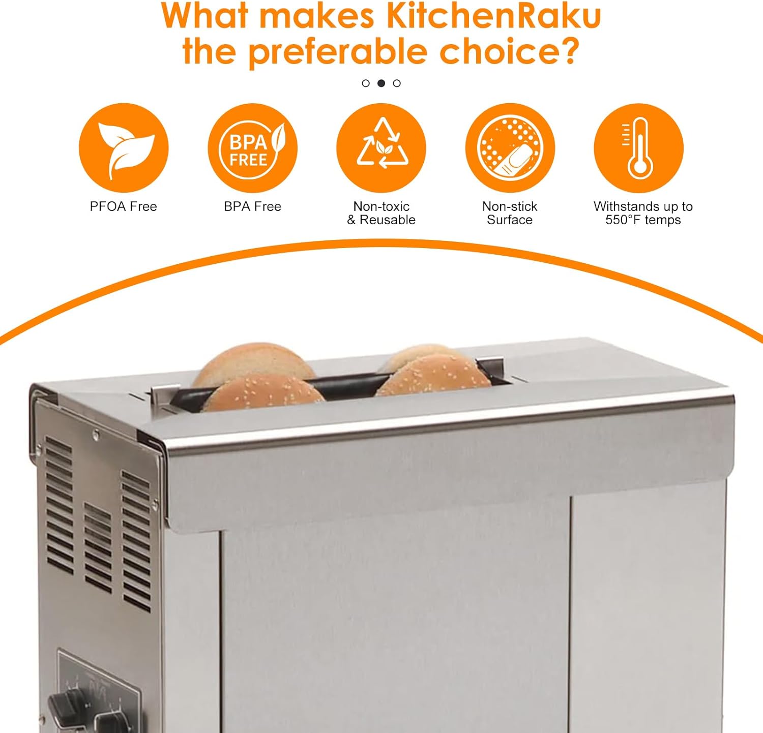 Cook's Aid presents the A.J Antunes Round-up PTFE non-stick release sheets, designed specifically for VCT-25, VCT-50, VCT-1000, and VCT-2000 toasters. These sheets are placed over the toaster's heat platen, enabling buns to slide down effortlessly, ensuring perfectly cooked buns every time. Not only do these release sheets make it easier to achieve flawless buns, but they also contribute to keeping your toaster cleaner, especially when using buttered buns. In a busy kitchen, these sheets save time and effort, allowing you to focus on other tasks while ensuring consistent bun quality. With their durable PTFE non-stick coating, these release sheets are built to last and provide reliable performance. Upgrade your toasting experience with Cook's Aid A.J Antunes Round-up PTFE non-stick release sheets.