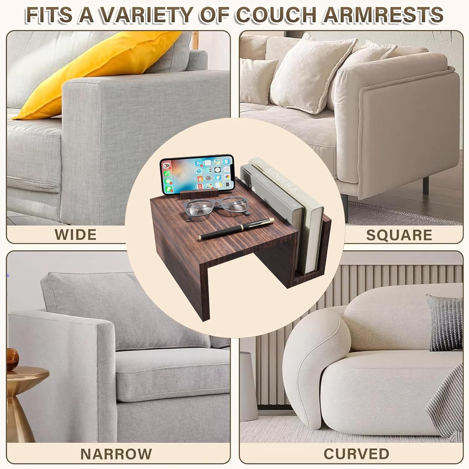 Features:The design of this wooden armrest table is very thoughtful. It comes with a magazine rack, making it convenient for us to easily place various magazines and avoid clutter. There is also a 360 degree rotating phone holder, which can be easily adjusted for watching videos in landscape or scrolling through information in portrait, meeting various usage needs.Our sofa armrest table is made of pine wood material, which has a hard and sturdy structure, excellent stability and long-lasting performance, and can withstand daily wear and tear. At the same time, the pine wood has a beautiful texture, adding a natural beauty to the table.Specifications:Material: Pine WoodColor: BrownPackage Included:1 x Wooden Armrest TableNotes:Due to manual measurement, there may be some errors in size.Due to different screen displays, colors may vary slightly.