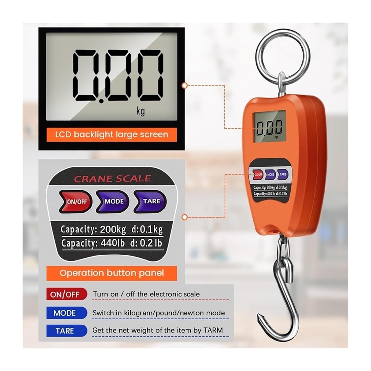 Specification:Product name: electronic hook scaleWeighing range: 500g-200kgGraduation value: 50 gramsPower supply mode: two AAA batteriesScreen display: LCD backlight white screenProduct material: ABS plastic/steel hookPower supply mode 2 AAA batteries (not included)Graduation: 200kg/50gColor: Orange/Black