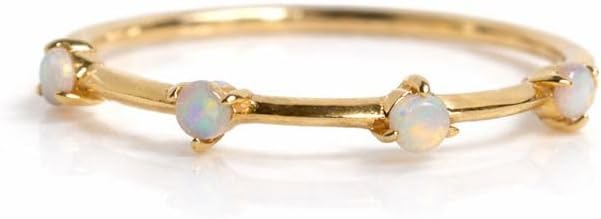 This dainty opal stacking ring is a timeless piece designed for effortless elegance. Featuring evenly spaced round white opal accents, the ring offers a soft, luminous glow that complements any style. The opals display subtle rainbow flashes, adding charm without overpowering the minimalist design. Crafted in a high-quality yellow gold finish, this slim band is perfect for stacking with engagement rings, wedding bands, or wearing solo for a delicate everyday look. Its lightweight and comfortable design makes it ideal for daily wear, while the opal stones add a meaningful touch of beauty and symbolism. A perfect choice as a wedding band, promise ring, anniversary gift, or dainty everyday jewelry, this opal ring is made to be cherished.