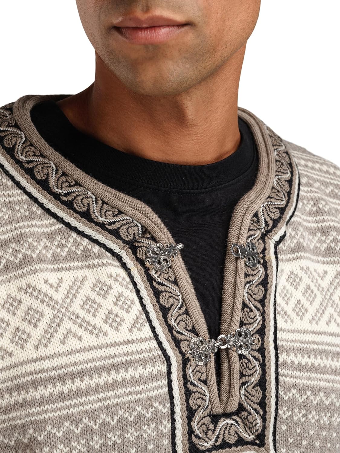The Setesdal design is the most recognizable Norwegian pattern and has been knitted for generations. The small v-shaped dots are known as the lice pattern, while the crosses were believed to protect from evil spirits. Made with long-lasting Norwegian wool, Norwegian-made pewter clasps and embroidered band, identical to the original design.