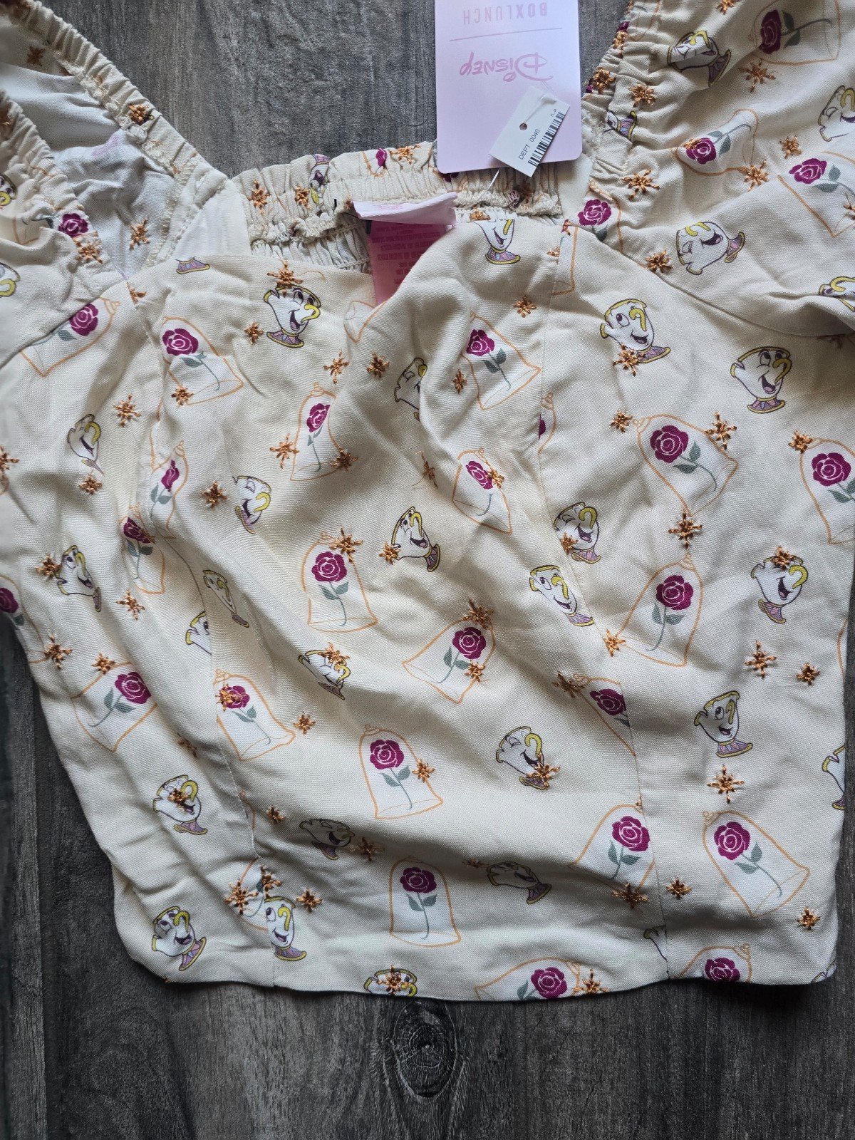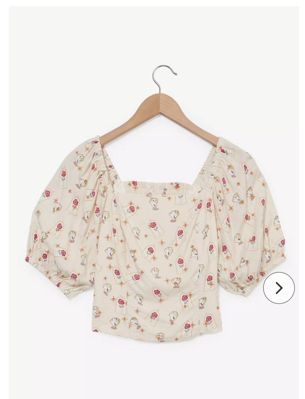 Prepare for a tea party in this Beauty and the Beast top! Featuring an allover print of Chip and the enchanted rose, this top includes embroidered star details. With puff sleeves and a smocked back, this cropped shirt is perfect for a day at the Disney Parks.