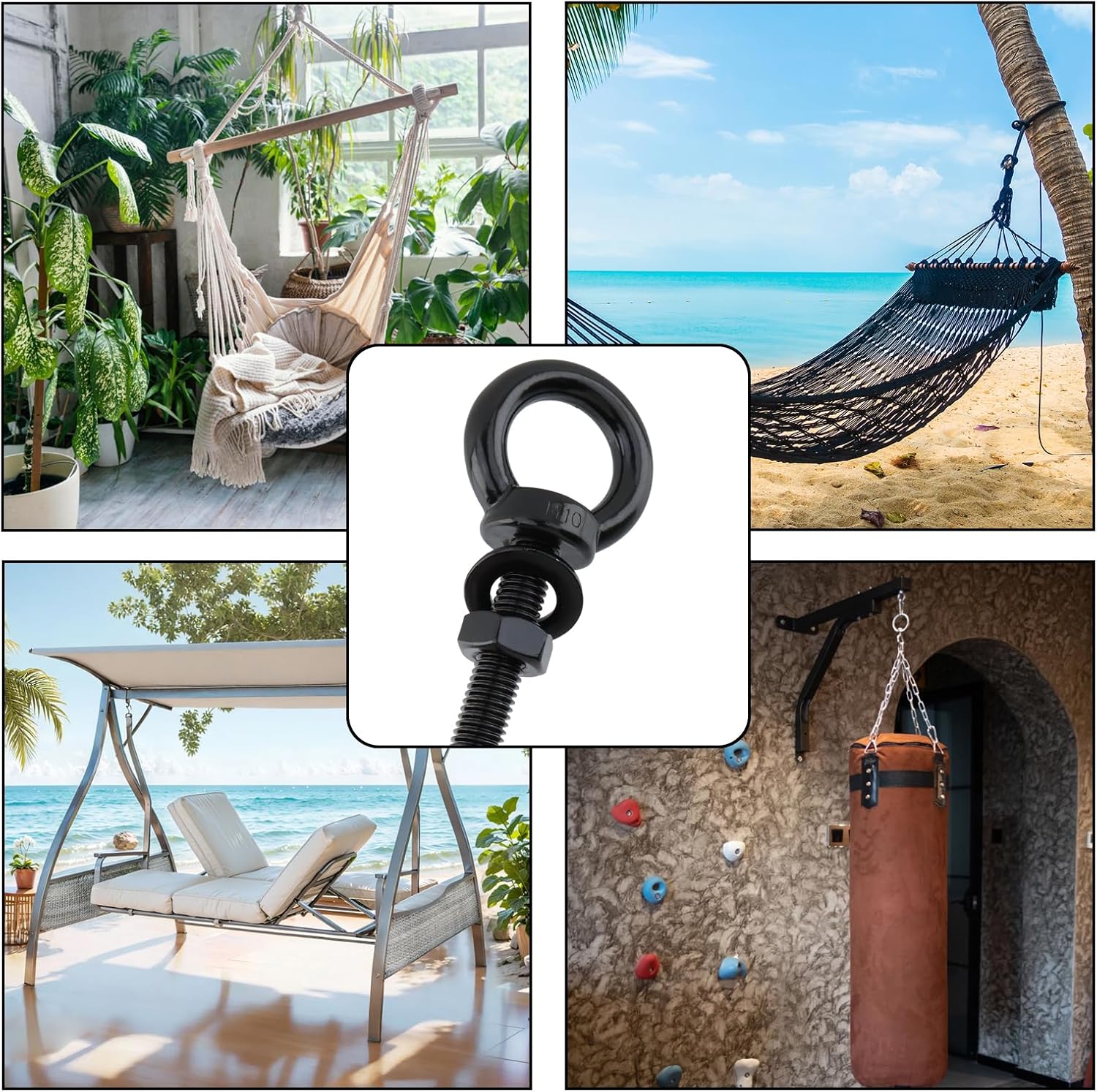 Features: Features: The eyebolts are highly suitable for various applications, and can be used to string ropes and cables together, secure jaws, rings and hooks, or as a connection point to easily secure, anchor, pull, push or lift objects Specification: Material: 304 stainless steel Color: Black Package Includes: 4 pcs M10 threaded eyebolts, 4 pcs hex nuts and 4 pcs washers
