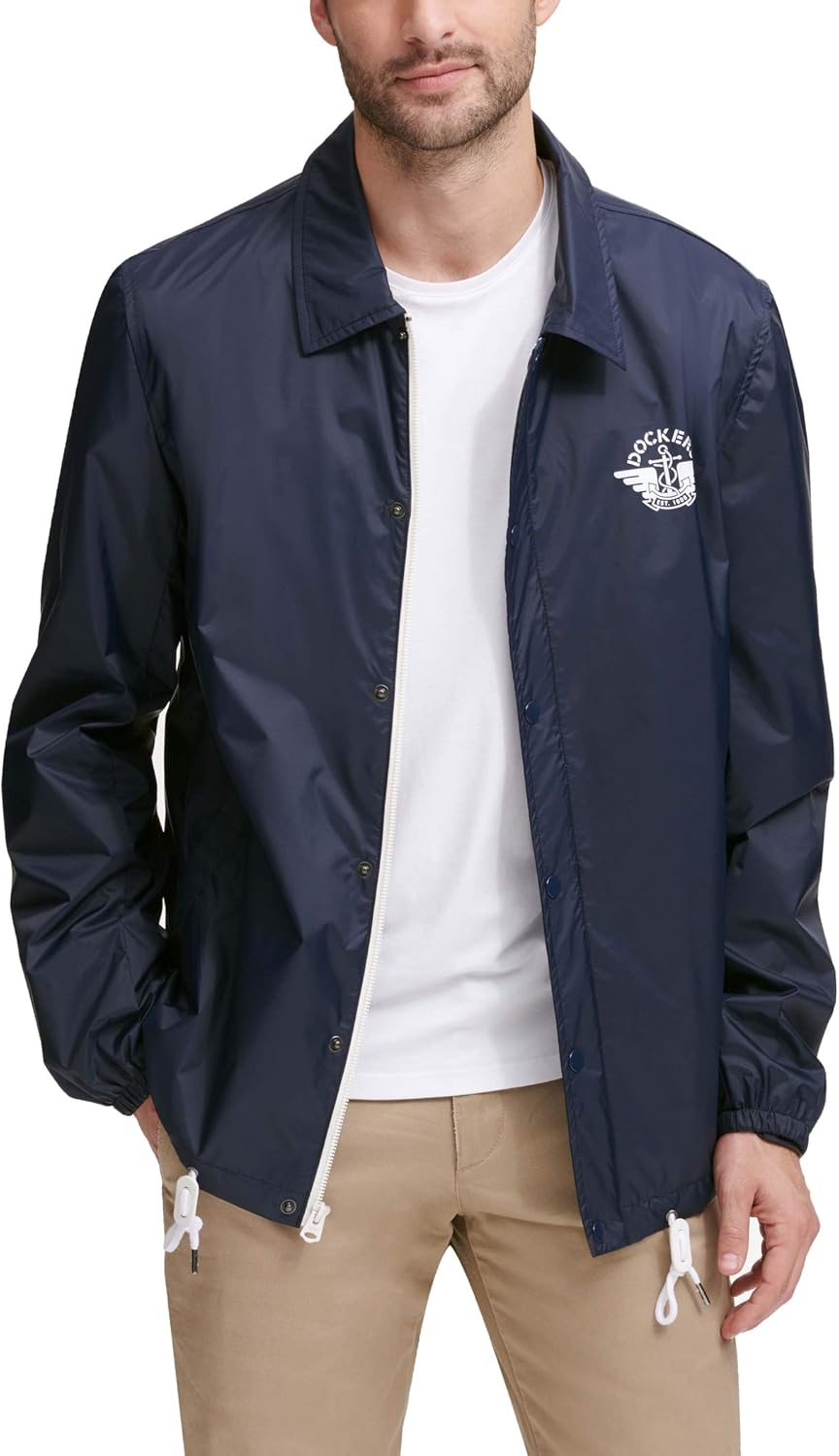 Classic coaches lay down collar jacket in a breathable and water resistant nylon with mesh body lining, center front placket with hidden zipper and snap closure, draw cord at waist band, elastic cuffs, Dockers anchor screen print on left chest, two lower welt pockets and one interior welt zipper pocket.