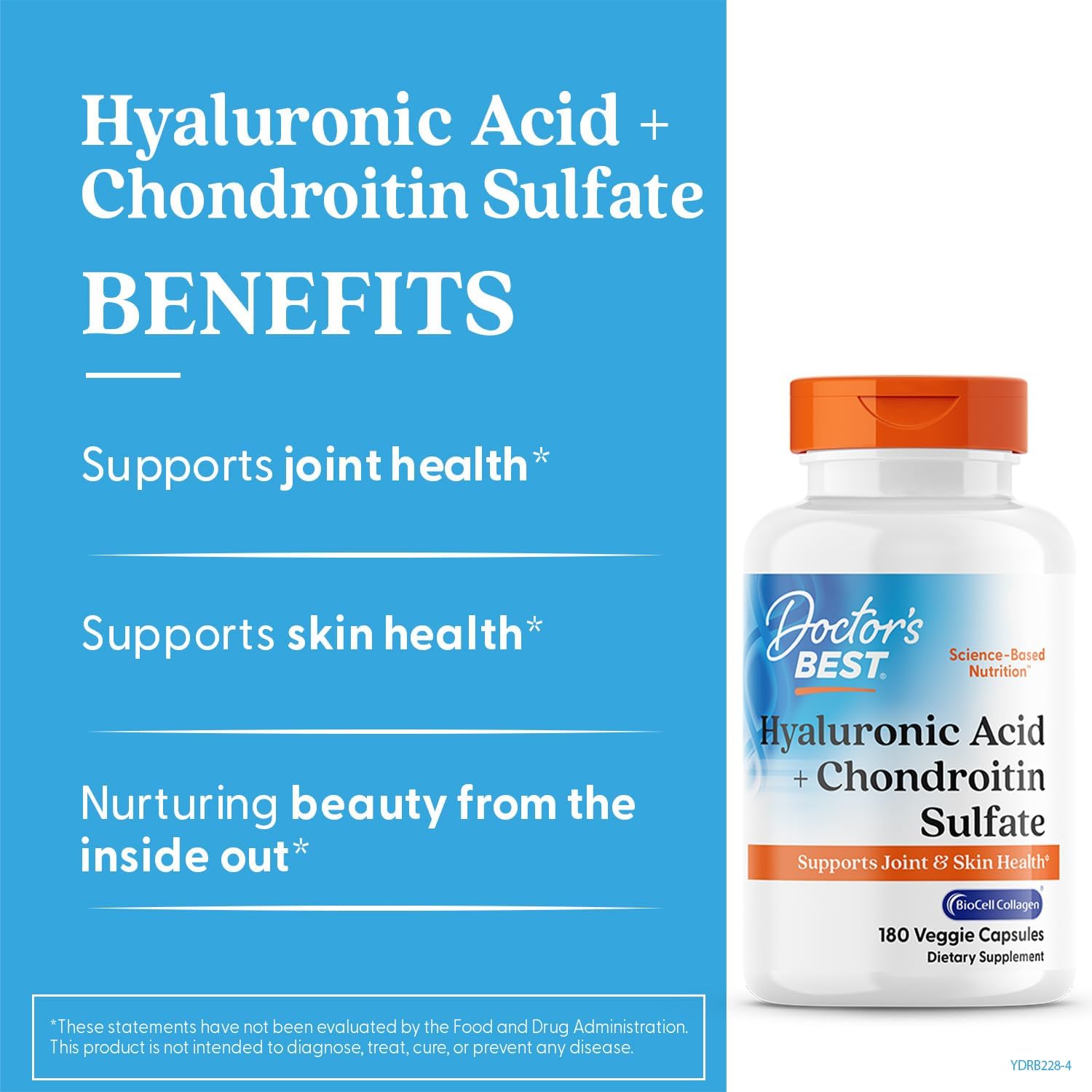 Best Hyaluronic Acid wth Chondroitin Sulfate contains patented BioCell Collagen II (US patents 6, 025, 327; 6, 323, 319; & 6, 780, 841). BioCell Collagen II is sourced from chicken sternal cartilage and provides bioavailable, low molecular weight hyaluronic acid. It is standardized to contain 10% Hyaluronic Acid, 20% Chondroitin Sulfate, and 60% Collagen Type II. Hyaluronic Acid and Collagen are vital structural components of the skin that decline as we age, and are partly responsible for the skin's moisture, suppleness and elasticity. BioCell Collagen II contains key components that can help support healthy skin and joint function*.