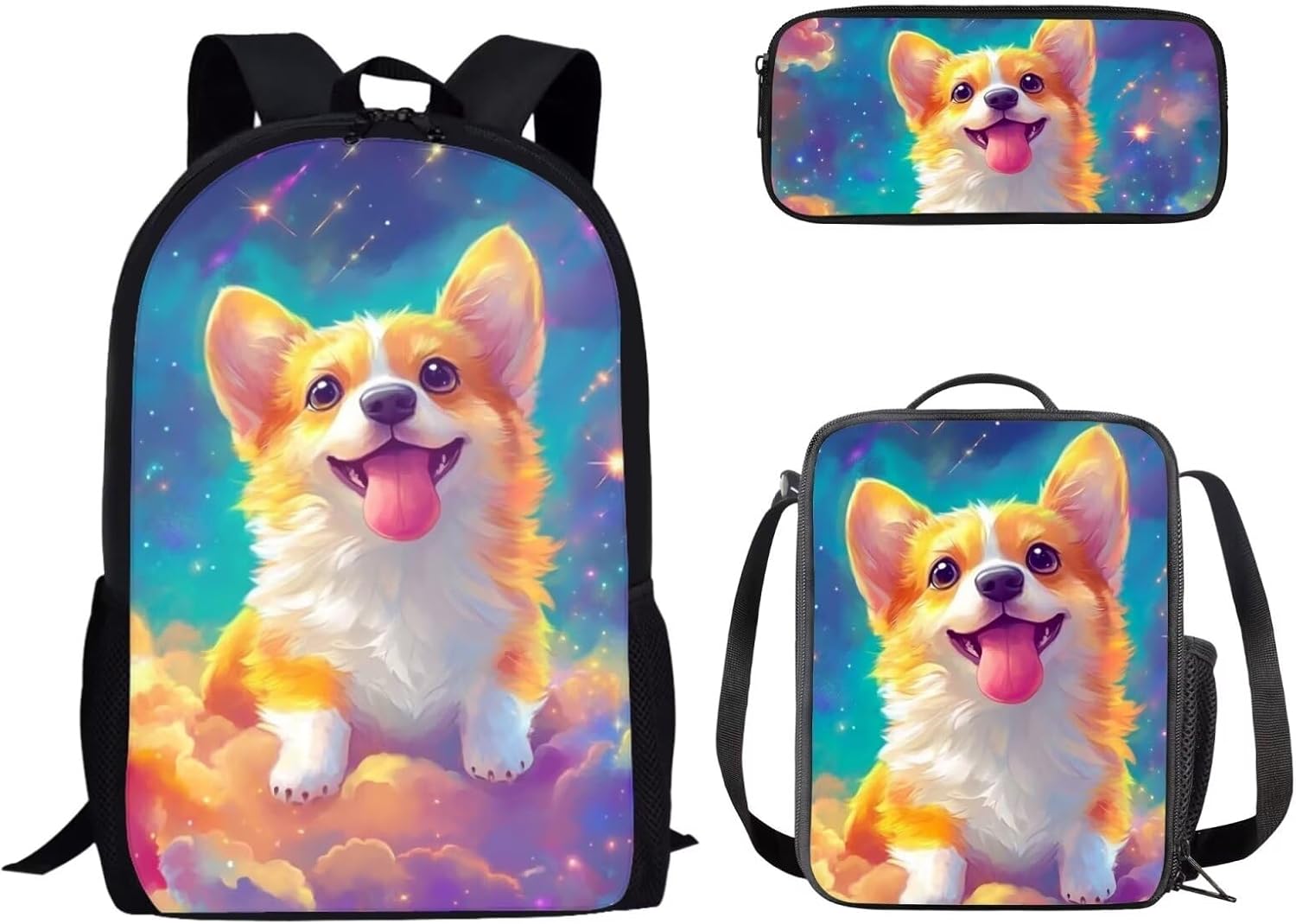 Children School Backpack- Compartments:2*side mesh pouch,1* zipper pocket;- Made of polyester. Polyester is the popular and ideal lightweight material for ultra-strong and heavy duty backpacks.- Ergonomic, dual padded, reinforced, adjustable shoulder straps. This provides optimum comfort for your shoulders. Adjustable shoulder straps are perfect for choosing the appropriate length of the straps that enable it to fit snugly on your shoulders. Perfect for ages 5 to 19 years old students (kids to teens)- Fully-padded back panels. Weekend Shopper school backpack delivers optimum comfort for your back with the full padding feature. When worn, it rests comfortably on your back.Pencil Case-3D PRINTED:Vivid parrten designs,rectangular shape,longer length,fits longer pencils or longer items,convenient and practical, with beautiful bright loved colors.- MULTI-FUNCTIONAL:Portable pen pencil bag for students to store all kinds of stationery,also can be pencil case,cosmetic bags,cell phone bag and coins purse bag,suitable for both office,school,home use.Lunch Bag- Mid-sized:7.48inch(L)x3.14inch(W)x9.84inch(H);Type:1-2 Persons- Main Material:Polyester,the Fabric Keeps Food Hot/Cold;Lining Material:EVA+PE Cotton- Designed with a deep and spacious interior:It Can be used as lunch bag, Picnic bag, sundry bag or shopping bag(have heat preservation, cold, fresh function, going to the supermarket, can be used to pack frozen food, hot pot dishes, frozen drinks, ice cream, dairy products, etcNotice:1) Please allow little color difference due to different camera or light environment.2) Due to different methods of measurement, please allow dimension deviation