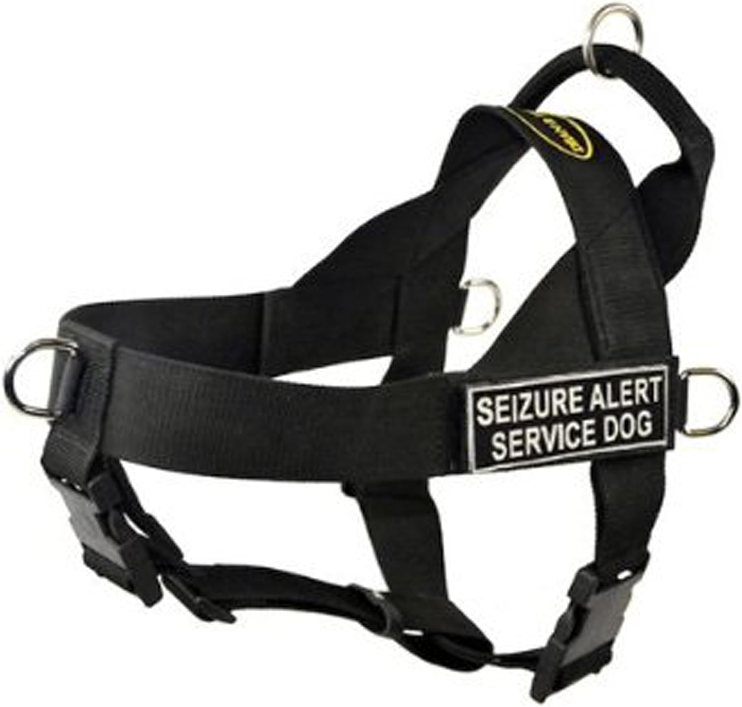 DT universal - Dean & Tyler no pull dog harness - 4 d rings - strong neoprene nylon - medium (fits girth: 30" - 39") - black with seizure alert service dog patches.