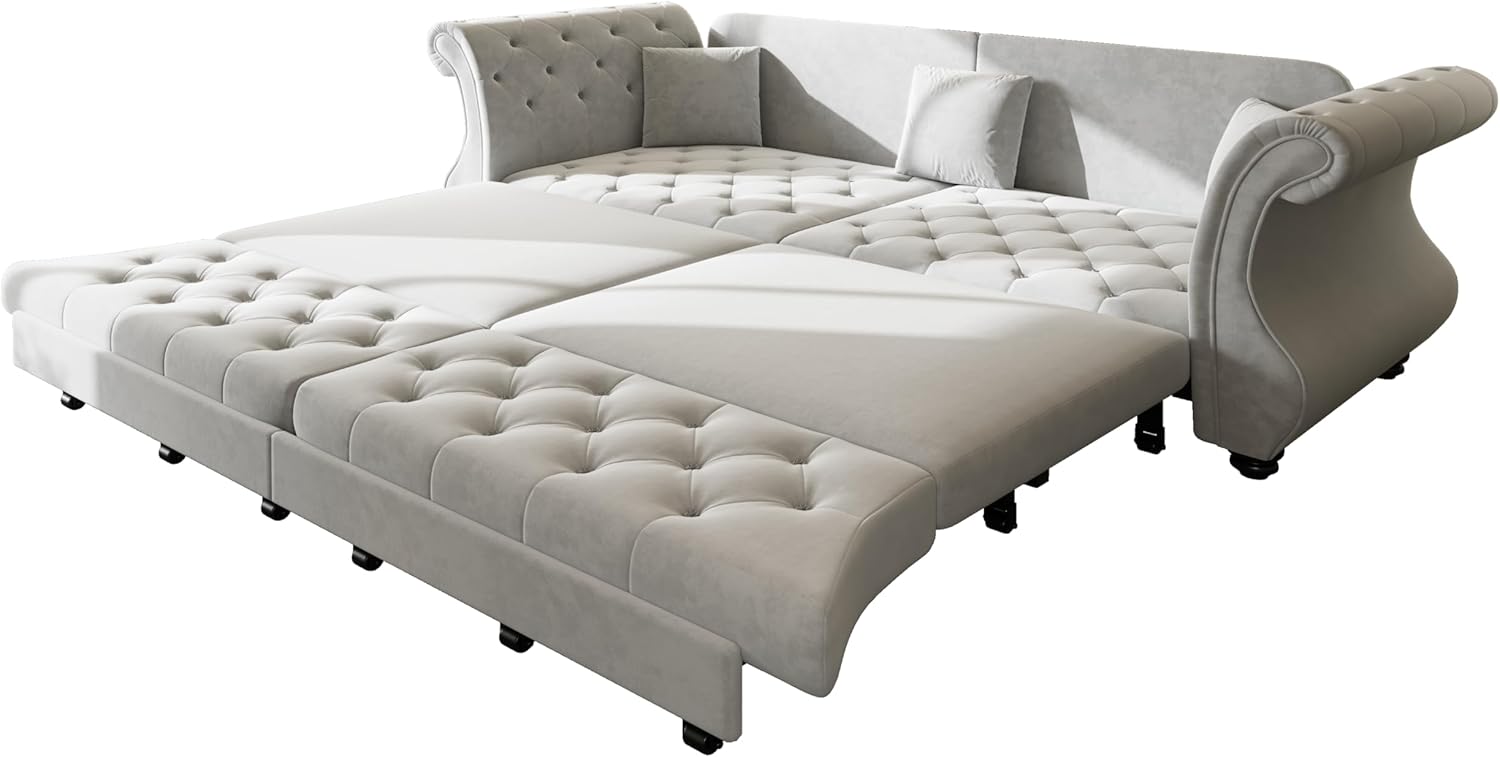 Eafurn 97.6" Oversized Sleeper Sofa Bed Pull Out Couch Bed King Size 4 Seater Chesterfield Loveseat with Rolled Armrest for Living Room ApartmentSpecificationsProduct Type:Sleeper Sofa Couch BedSeating Capacity:4Upholstery Material: VelvetSeat Fill Material:Foam + Pocket SpringsBack Fill Material:FoamFrame Material:Solid + MetalSeat Construction:Solid wood + Sinuous SpringWeight Capacity:300 LBS each seat Weights & DimensionsOverall - sofa:97.6"*32.7"*34.6"HSleeper Size :77.6"*74.8"*12.2"HBack Height :16.5"HSeat Depth:26"Seat Height:18.1"Arm Height:31.1"Product Weight : 145.49 LBSPackage Size ( 2 Boxes )Package 1: 40.6 * 30.3 * 12.6 in. 81.57 lbs.Package 2: 40.6 * 30.3 * 12.6 in. 77.16 lbs.
