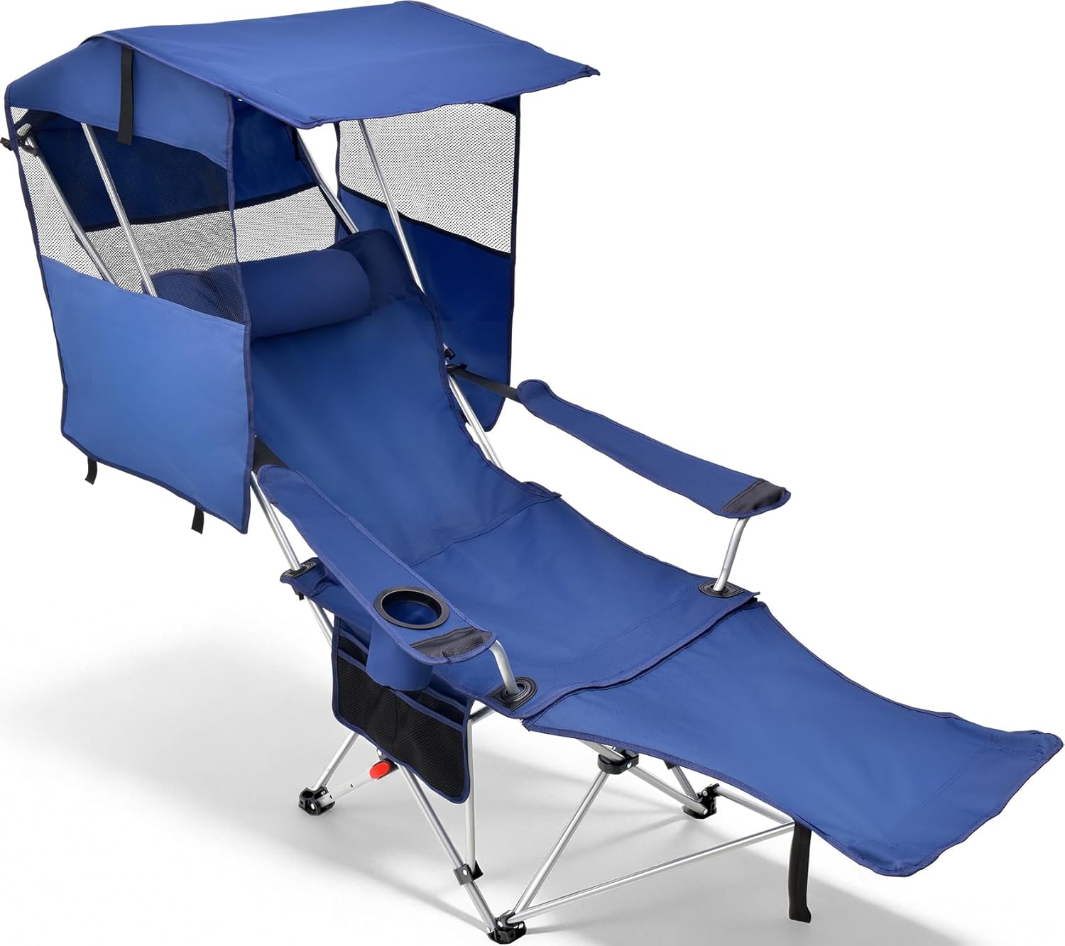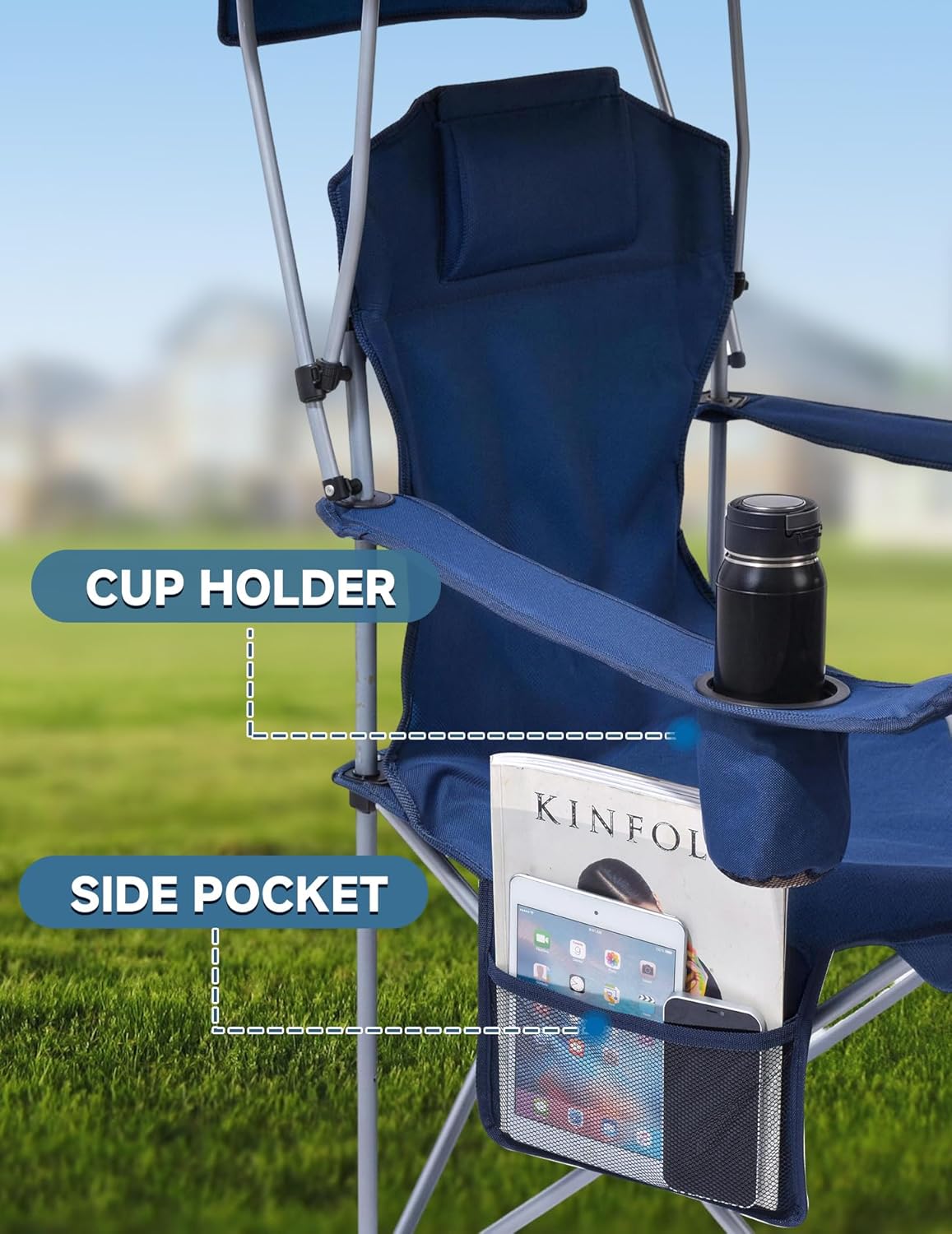 Welcome to your personal oasis of shade and relaxation. Designed for supreme comfort in the outdoors, our premium camping chair with shade delivers outstanding sun protection. With a spacious overhead canopy and a clever rear sunshade, you can enjoy your time outside without the harsh rays interfering. Constructed with a robust steel frame, this camp chair with canopy confidently supports up to 330 lbs, ensuring durability for all users. The removable headrest provides gentle support for your neck, while the ample 25-inch high backrest encourages you to sit back and unwind comfortably. With a handy side pocket and a cup holder, your essentials are always within reach. The real game-changer is its effortless portability. In seconds, the canopy folds into a compact carry case with padded shoulder strapsโtransforming your sports chair for adults with canopy into an easy-to-carry backpack. No extra bags, no fuss. Just grab and go. Whether you're at the beach, camping, attending sports events, or just relaxing in your backyard, this outdoor chair with shade is more than just furnitureโit's your go-to spot for shaded comfort wherever you are.