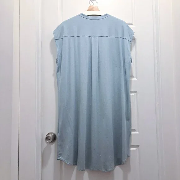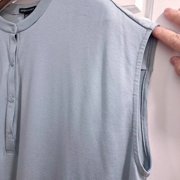 An easy dress that moves with you. With a mandarin collar and henley button closure. In Eileen Fisher polished and sustainable Fine Jersey.- Relaxed fit- Designed to be oversized- Mandarin collar- 4-button henley front closure- Dolman cap sleeves- Back yoke with box pleat, curved high-low hem- New with tagback center top to hem: 38 inches approxarmpit to armpit: 26 1/2 inches approxBrand: Eileen FisherSize: XLColor: DawnFabric: 93% Lyocell and 7% elastaneCare: Wash cold, delicate cycle
