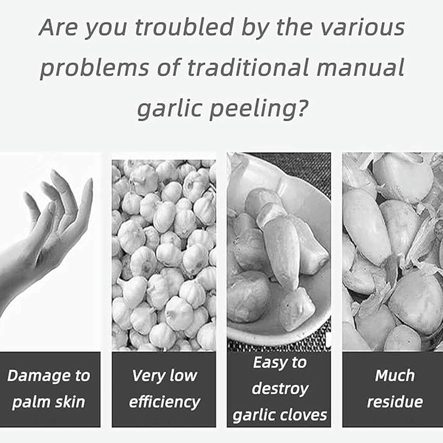 The whole garlic peeling machine can peel the whole garlic without separating it. The main function of the machine is high efficiency, which solves the problems of slow peeling and hand pain.Specifications: Name: Whole Garlic Peeling Machine Material: Stainless steel Motor power: 200W Rated voltage: 110V-240V Efficiency: 20kg/hour Equipment size: 24*24*48cm Package size: 54*31*31cm Net weight: 8.5kgPacking list: 1* Garlic Peeler 1* English manualAbout peeling: The garlic machine can only remove dried garlic, if it is chopped into granules and dried in the sun, the effect will be better The peeling rate of red garlic/purple garlic/garlic is low, please buy carefully Wet fresh garlic cannot be peeledAbout damage: The garlic will be a little damaged (customers who cannot accept it should not shoot it), but it will not affect the use of the garlic. Not suitable for buying and selling in the market (suitable for personal use in hotels, barbecue shops, western restaurants, etc.) The main function of the machine is high efficiency, which solves the problems of slow manual peeling and hand painNotice 1.Before starting the machine, please carefully check whether there is any debris in the peeling barrel 2.Make sure the machine cover is locked 3.Put the garlic to be peeled into the funnel, preferably dry garlic, so that the peeling rate will be higher 4.Before cleaning and disassembling, please disconnect the power and stop the machine 5.During processing, please do not press the switch with wet hands
