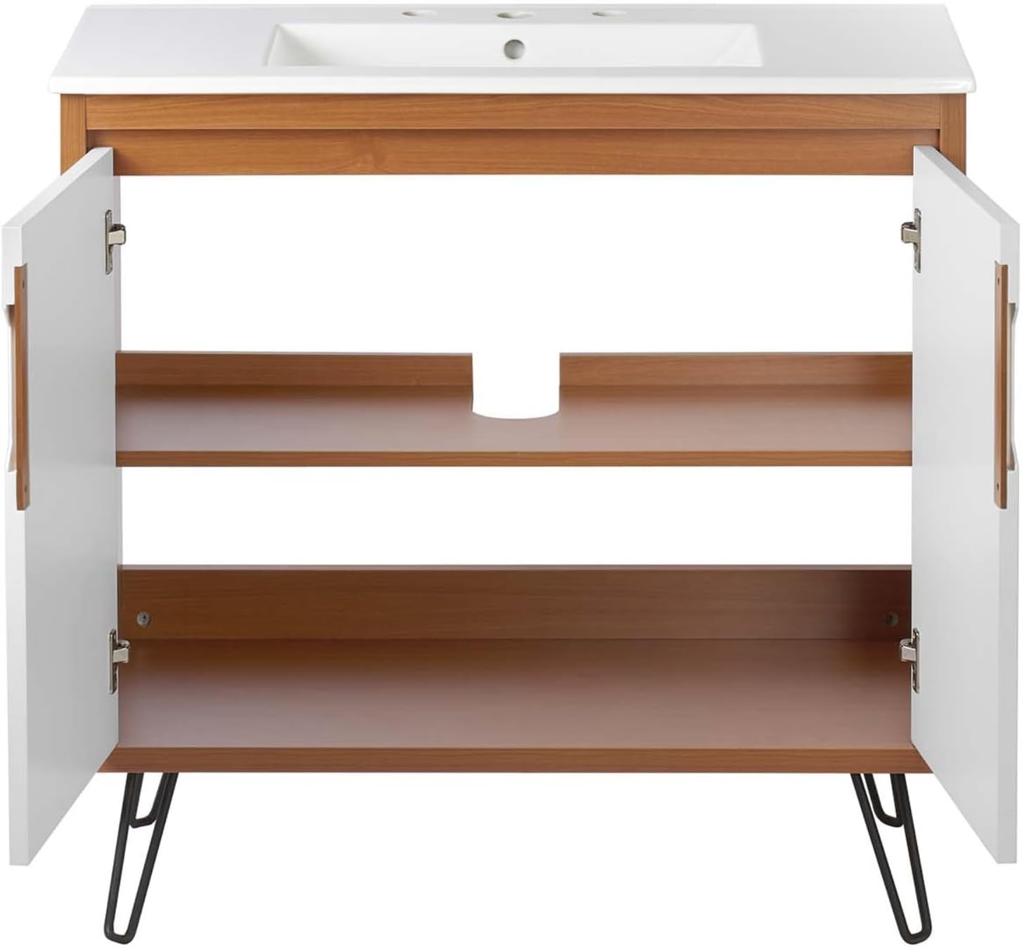 Introducing the Energize 36" Bathroom Vanity, a stunning addition to your bathroom decor that effortlessly infuses mid-century modern energy. This vanity exudes style and functionality, making it the perfect choice for any bathroom makeover.Crafted with a combination of durable particleboard and MDF construction, this vanity is built to withstand the test of time. The ceramic sink basin features 8-inch centerset holes, providing ample space for your favorite fixtures. The integrated countertop adds a touch of elegance to the overall design.Resting on four sleek metal hairpin legs, this vanity exudes a Scandinavian modern vibe that complements a wide range of decor styles, from modern to contemporary. The dual soft-close doors with cutaway designs offer easy open and close functionality, while also providing a spacious storage area to keep all your bathroom essentials organized and concealed.Assembly is required, but the end result is well worth the effort. The Energize 36" Bathroom Vanity is a dynamic piece that will transform your bathroom into a stylish oasis. Please note that fixtures are not included.With its compact dimensions of 18.5"L x 36"W x 34"H, this vanity is perfect for smaller bathrooms or those looking to maximize space. The overall cabinet dimensions are 17.5"L x 35"W x 34"H, ensuring a perfect fit in any bathroom. The plumbing cut-out dimensions are 3.5"W x 21"H, and the leg dimensions are 3"W x 7"H. The overall sink dimensions are 18.5"L x 36"W x 6.5"H.Upgrade your bathroom with the Energize 36" Bathroom Vanity by Ergode. Its mid-century durable construction, and ample storage space make it a must-have for any bathroom renovation project. Don't miss out on this stylish and functional piece that will elevate your bathroom decor to new heights.